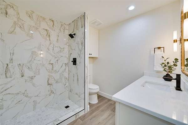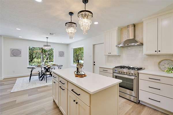 - Beamed Ceilings, Ceiling Fan(s), Ceiling-High, Chandelier, Double Vanity, Entrance Foyer, Kitchen Island, No Interior Steps, Pantry, Primary Bedroom On Main, Quartz Counters, Recessed Lighting