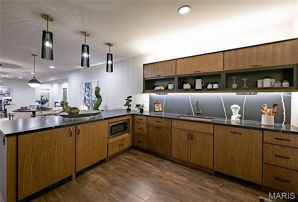 The open floor plan offers sophisticated interior detailing and upscale appointments throughout. As you approach the home, you’ll immediately notice the peaceful, relaxing setting, complete with the tranquil sounds of water flowing across the pond’s rocks. Step through the custom front door and you’re welcomed by warm hardwood floors that flow beautifully throughout the main living spaces. Just off the entry, a private office provides the perfect space to work or unwind away from the main living areas.