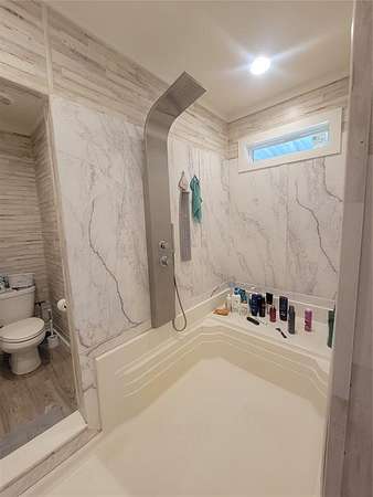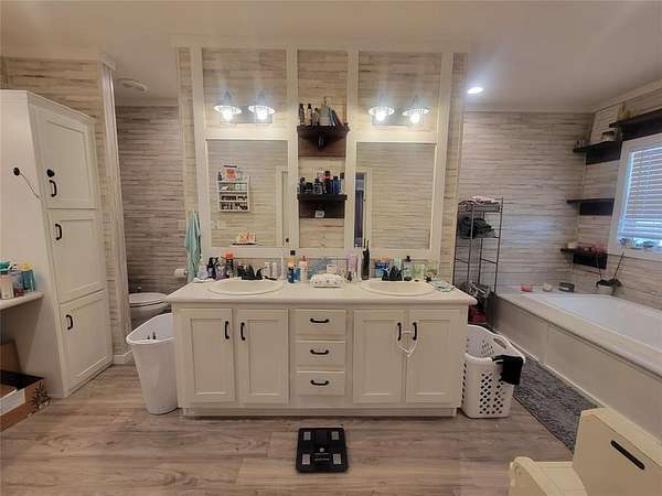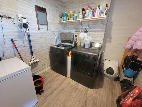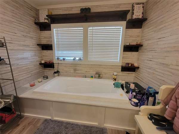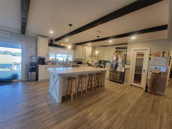 Welcome to this spacious well-appointed 5-bedroom, 3-bath home situated on a fully fenced 2-acre property, ideal for those seeking privacy, functionality, & a touch of country living. A solar-powered gate welcomes you into the property, where you'll find a chip seal driveway, mature pear trees, & ample space for both relaxation & recreation. The home itself is a beautifully maintained double-wide with a metal roof, featuring a 2-car carport & an additional covered parking space for a boat or RV. Inside, the open-concept living area is perfect for gathering, with decorative ceiling beams, can lighting, & a large living room centered around a cozy wood-burning fireplace accented in Austin limestone. The kitchen offers a generous island with a breakfast bar, solid surface countertops, a stainless steel apron sink, & a walk-in pantry. Stainless appliances include a dishwasher & vent hood, with a propane stove & water heater providing efficient functionality. The adjacent dining area & spacious utility room-with access to the covered back patio-enhance everyday convenience. The layout offers excellent separation of space, with four secondary bedrooms & two full baths on one side of the home, & a master suite on the other. The oversized primary bedroom includes 2 walk-in closets, a spa-like ensuite featuring a large soaking tub, a walkthrough shower, double vanity, separate makeup vanity, & abundant linen storage. A dedicated media-playroom with beadboard paneling & decorative ceiling beams adds flexibility & charm. Outside, the amenities continue with an above-ground pool that is fully fenced, a chicken coop, an 8x40 storage container, & a covered patio ideal for relaxing or entertaining. The property also includes solar panels, a 200-gallon propane tank, with a yearly lease, & a 380 ft. deep water well with a sulfur filter & water softener. This home blends comfort, energy efficiency, and rural charm in a quiet setting with everything you need to live, play, and thrive.