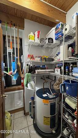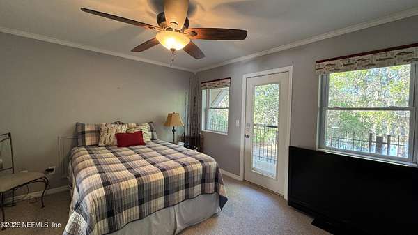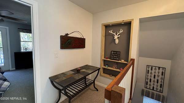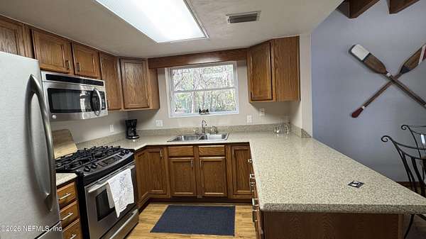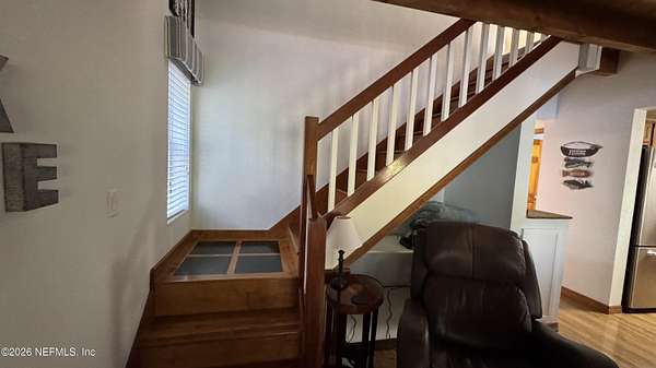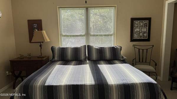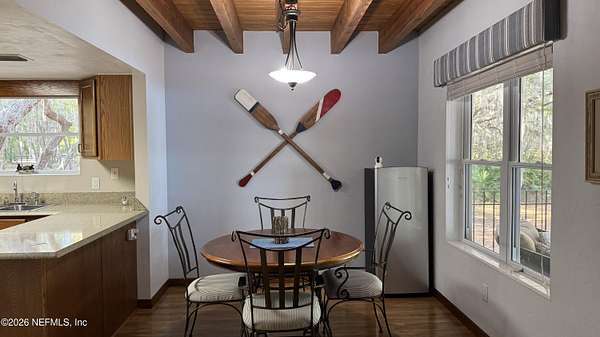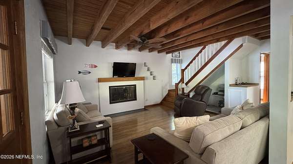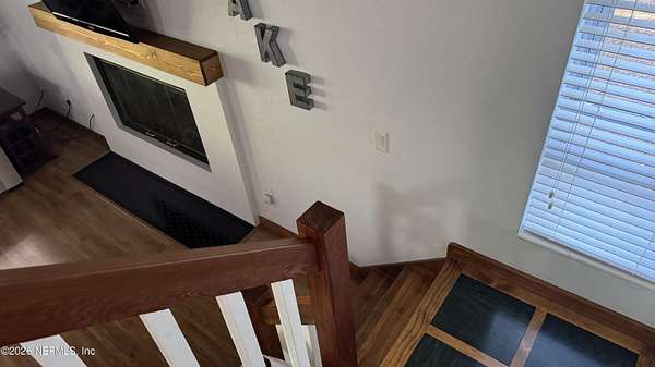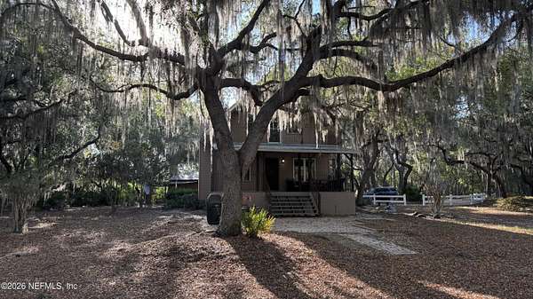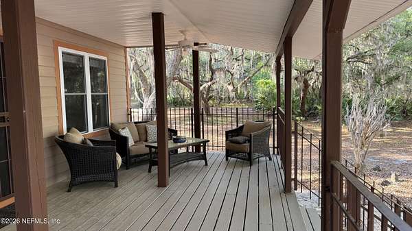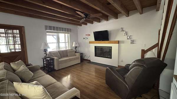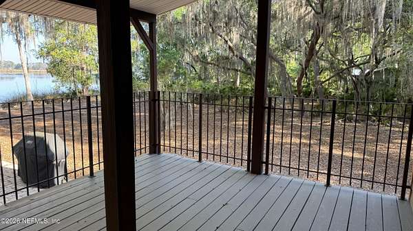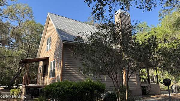 Gillis Pond in Hawthorne, Florida! Your own peaceful, happy place on 3.17 scenic acres. Built in 1997 and beautifully maintained, this home feels like new with a bright, open living area that flows to a deep, covered lakeside deck with modern metal railing, perfect for morning coffee or unwinding by the water. Rustic wood beam ceilings, a cozy gas log fireplace, and a durable metal roof add warmth and charm. Kitchen appliances convey for easy move-in. Upstairs, a bedroom opens to a private lakeside balcony, creating a quiet retreat with serene views. Blinds and valances stay. Outside, enjoy a barn/workshop with vehicle space, overhead storage, and laundry area, plus lean-tos for extra covered parking. An RV port with front and rear access and hookup adds convenience. Sold as-is.