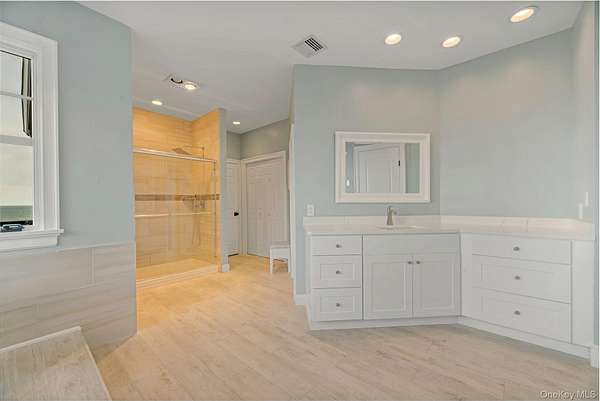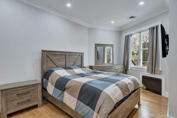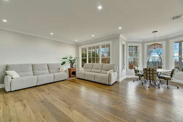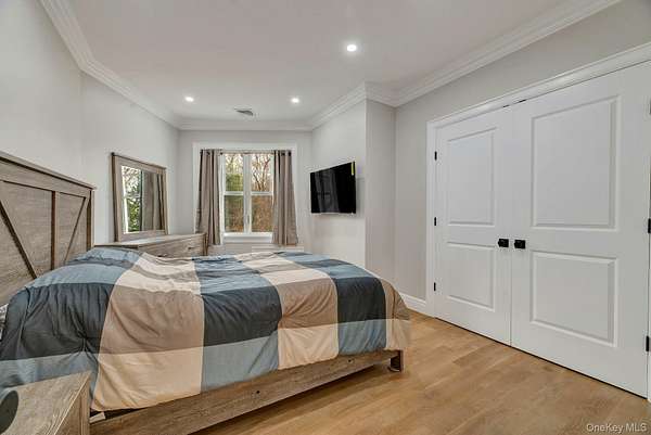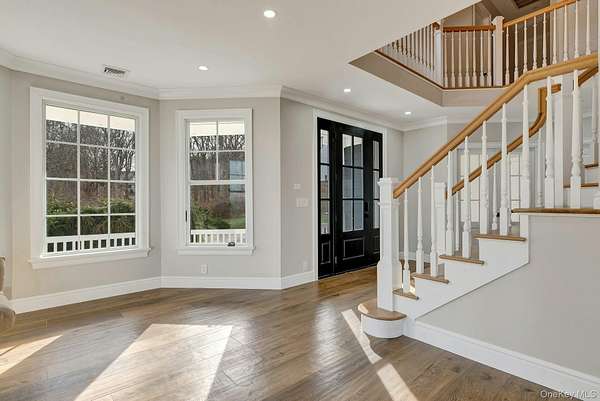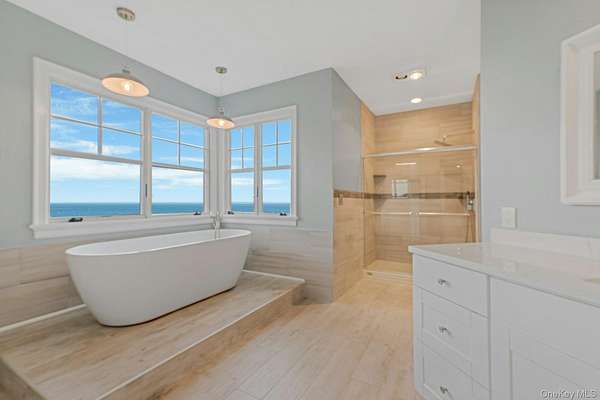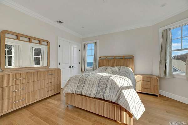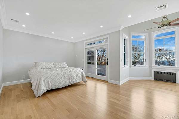 Upstairs, the luxurious primary bedroom offers an entirely new en-suite bath with an oval soaking tub positioned to take in the breathtaking water views. The second floor also includes two additional bedrooms plus a flex room, along with an updated hall bath. Beautiful 4-inch white oak flooring runs throughout the second floor, complemented by a beautiful staircase with new railings and new seven-foot interior doors. All walls and ceilings have been skim-coated and freshly repainted, and new crown molding enhances the entire home. The attic has been upgraded with new plywood flooring for excellent storage.