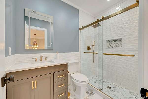 Inside, the home has been completely transformed with high-end updates and 9 foot ceilings on the first and second floor. The main floor includes an elegant formal dining room, a formal living room, a spacious family room, a large laundry room/mudroom, a multipurpose room that can serve as an office and a newly designed chef's kitchen featuring cream cabinetry, gold hardware, quartz countertops, a center island, Bosch 36-inch cooktop with downdraft, Sharp microwave drawer, Bosch 800 series dishwasher, Bosch French-door refrigerator, and KitchenAid double wall oven. The entire first level showcases new Marazzi Vero porcelain wood-look tile with three-zone radiant heat and an updated powder room with new Kohler fixtures.