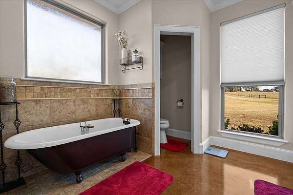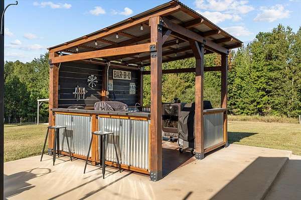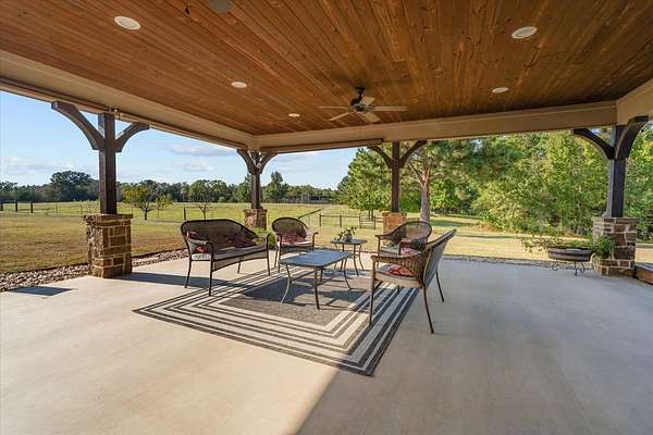 The three bedroom, two and one-half bath home features-stained concrete floors throughout, creating a seamless, low-maintenance flow. Cozy up by the wood-burning stove on cooler evenings, or step out to the covered front porch for morning views. The spacious primary suite boasts an en-suite bathroom with dual vanities, standalone tub, and a large walk-in shower. Two well-appointed guest bedrooms share a convenient Jack and Jill bath with dual vanities and a shower/tub combo. Outdoors enthusiasts will love the expansive covered patio featuring an outdoor kitchen and shower, ideal for entertaining and unwinding. The property's agricultural appeal includes 25-acres of fenced pasture, and additional 7-acre fenced area, a shipping container equipped with a corral, head gate, and alley, plus, a versatile 30'x30' barn/shop with a 10'x15' wing. Inside the barn, an office with window unit provides a comfortable workspace. Call today to schedule a private tour.