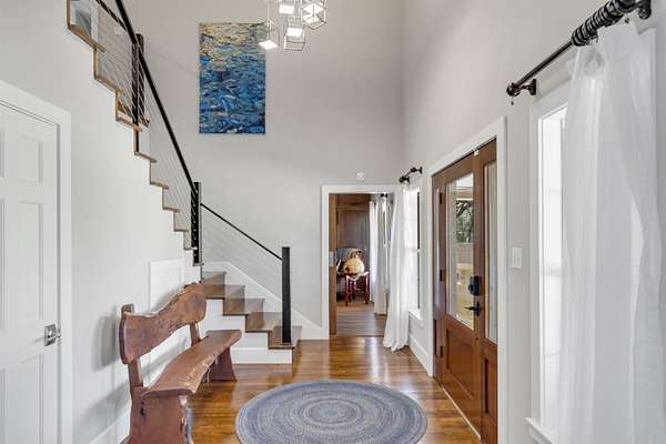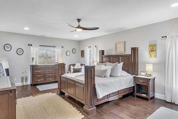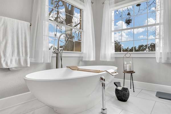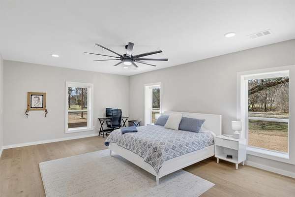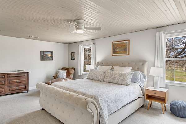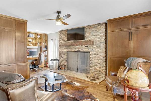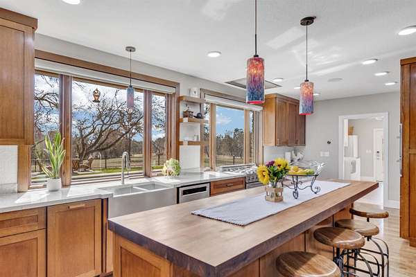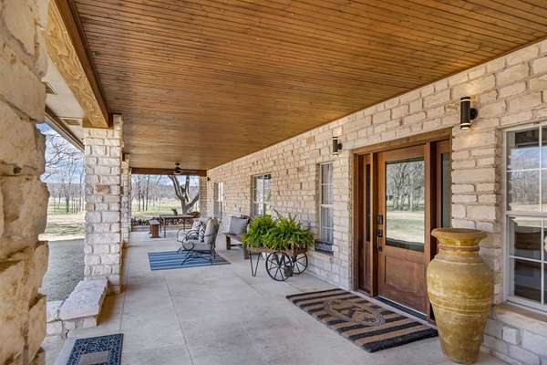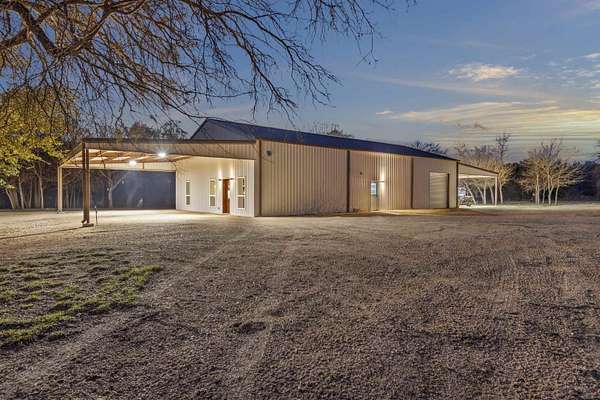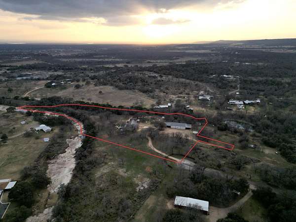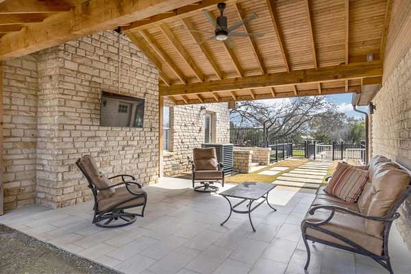 At the end of a quiet cul-de-sac, a secure privacy fence welcomes you to this stunning estate. Entering, you're greeted by a timeless windmill, a nod to the land's heritage and the old wagon trail that once crossed here. Set on nearly seven oak-studded acres, this all-stone Hill Country estate has been thoughtfully updated throughout. Custom cabinetry enhances nearly every space in the home, which features 3 bedrooms and 3 1/2 baths. The kitchen, overlooking the pool, boasts electric blinds, high-end appliances, a premium range with double ovens, and a built-in espresso machine, a chef's dream. On the west end, the private office features a fireplace and a floor-to-ceiling custom cabinet system, plus a Murphy bed for guests. Step outside to discover a private retreat with a 2020-built pool, hot tub, and sauna, all surrounded by low-maintenance turf. An expansive front porch and charming breezeway provide perfect spots for relaxation, while a half-court basketball area offers fun for all. Separate from the main home is a dedicated game room and a private studio apartment with 1 bedroom and 1 bath. The barndominium includes imported Italian laminate flooring, 1 bedroom, 1 1/2 baths, and a laundry room for guests. Upstairs, a bonus/flex space awaits. The impressive 40x40 storage/shop area with epoxy-finished floors is on the north end of the barndo. A garden area with a tool shed and a large dog run complete this exceptional setting. With most furnishings negotiable, this luxury estate is a true gem.