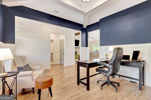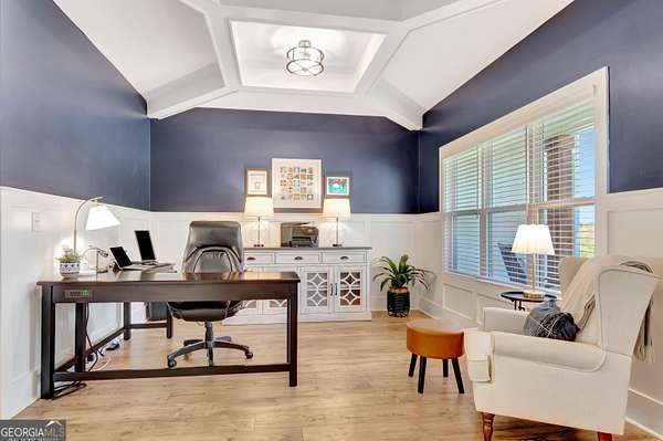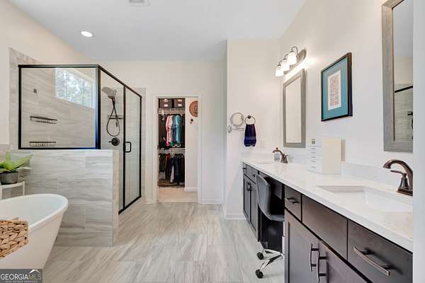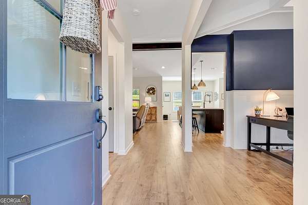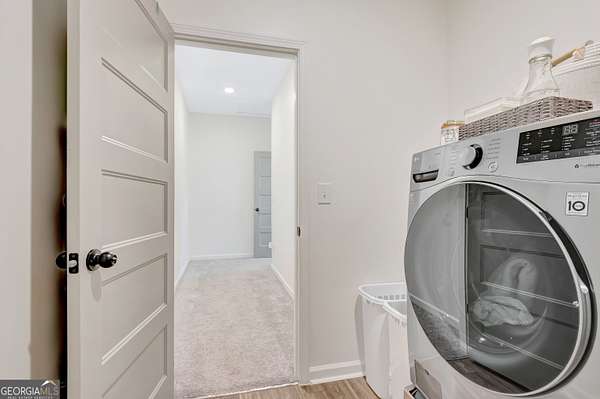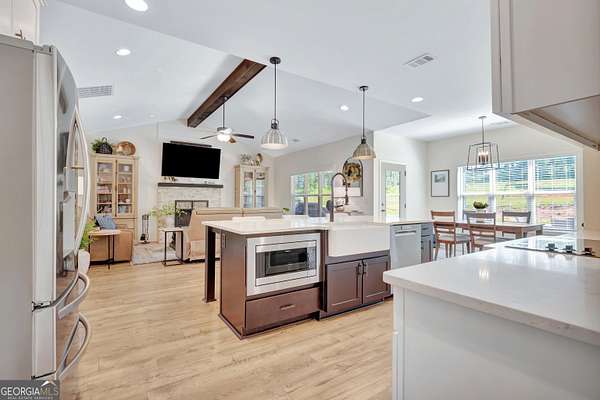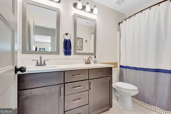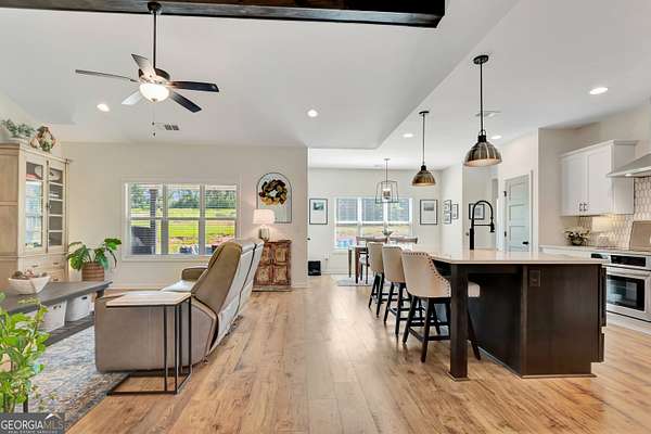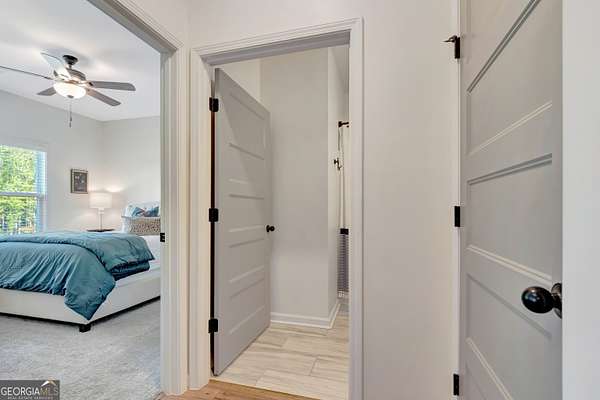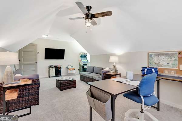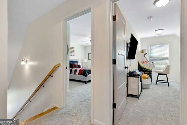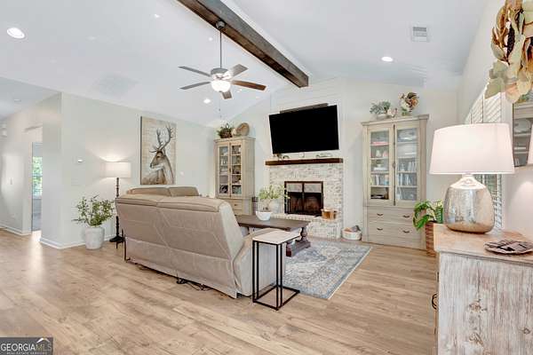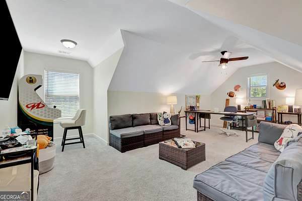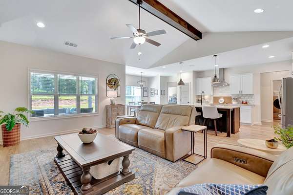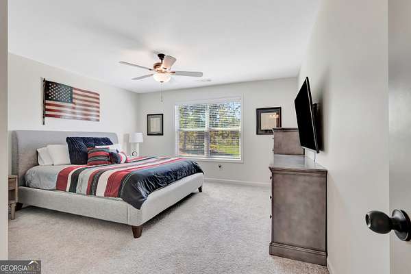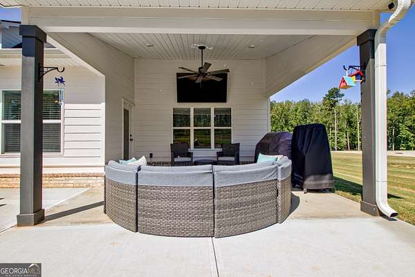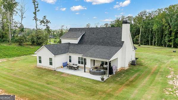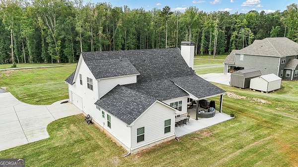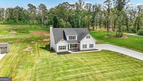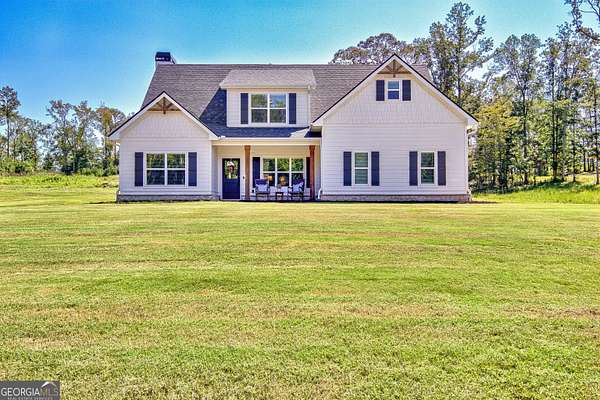 Welcome to this stunning Trademark-built Smithfield floor plan home, nestled on 5 acres just minutes from Downtown Newnan and convenient to I-85. This immaculately maintained property offers 4 bedrooms, 3 full bathrooms, and a bonus room. Step inside to find a spacious dining room that can easily flex as a home office or playroom, as well as a secondary bedroom and full bath on the main level-ideal for guests. The open-concept living area features beautiful luxury vinyl plank flooring and a cozy living room with a gorgeous brick fireplace. The chef's kitchen is a true gem with quartz countertops, a tile backsplash, a large island with seating, a white porcelain farmhouse apron sink, and stainless steel appliances. The adjacent eat-in kitchen space is perfect for casual dining and entertaining. The main-level primary suite offers a peaceful retreat with an en-suite bathroom, 2 walk-in closets, one with direct access to the laundry room for ultimate convenience. On the second floor, you'll find two additional bedrooms, a full bath, and a generously sized bonus room-ideal as a media room, workout space, or additional living area. Enjoy quiet mornings and peaceful evenings from your covered back patio, where you can take in breathtaking sunrise and sunset views plus you might catch a wildlife sighting. Area behind the home is terraced/graded for another structure to be added or garden! Septic is located in the front to accommodate a pool. The possibilities are endless! Additional features include: AT&T Fiber Internet, an oversized parking pad and two water heaters. Don't miss the opportunity to own your own private oasis with modern conveniences and timeless charm-all just a short drive from city amenities. *Also included in the sale are 8 TVs (two of which are 75 inch!), all patio furniture, refrigerator and a Zero Turn Lawn Mower!! *Not all GPS is accurate. Please note that Wild Boar way is located directly off Smokey Rd.
