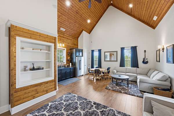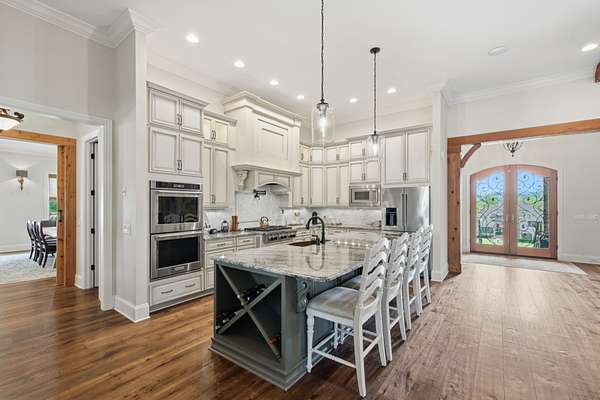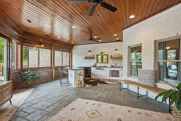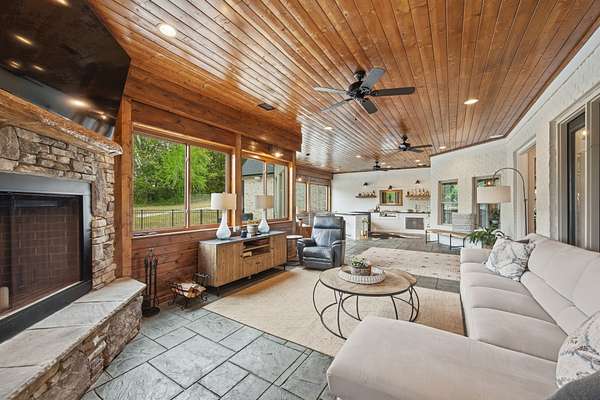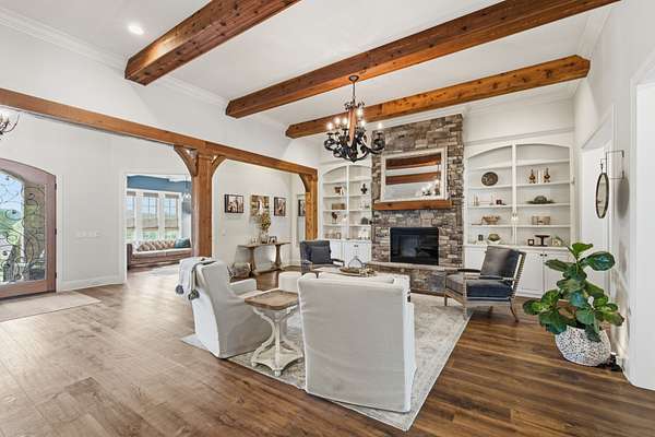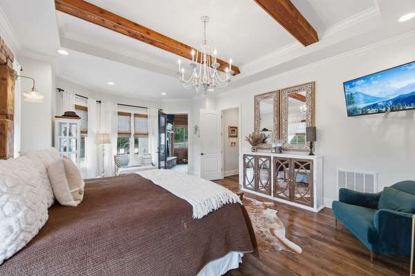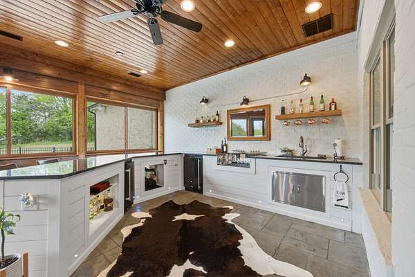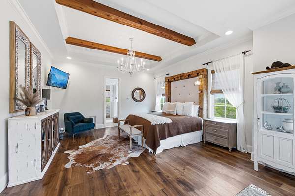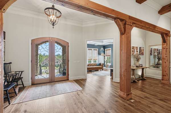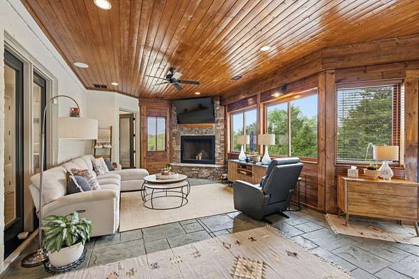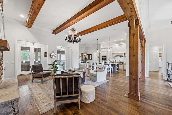 Perched atop one of the highest points in sought-after Saddle Springs and just steps from the Jaeckle Centre, this exceptional property offers a rare blend of privacy, craftsmanship, and elevated living within a premier equestrian community known for its connection to horses and outdoor lifestyle. The main residence features 4 bedrooms (all en suite) and a balance of warmth and refined finishes throughout. The fully updated primary suite offers a spa-like escape with Carrara marble, porcelain finishes, and an expansive wet room with soaking tub and rain shower. A custom reclaimed barn beam feature adds character, while the oversized closet with built-ins provides both luxury and functionality. Designed for both everyday living and entertaining, the home includes a dedicated theater room with a 117-inch screen, immersive surround sound, along with a private gym and adjoining spa-style bath. A whole-home audio system allows seamless control of sound throughout, creating the perfect atmosphere in every space. A detached (additional 542 square feet) carriage house adds flexibility and appeal, ideal for a guest house, private office, or studio! Behind the scenes, the home is equally impressive with five high-efficiency HVAC systems, radiant barrier roofing, UV air purification, tankless water heating with recirculation, and whole-home water filtration. Additional features include 400-amp electrical service, fiber internet, and integrated security and fire systems. Step outside to a private retreat designed for both relaxation and entertaining. A 15x40 concrete-lined pool with sun shelf and integrated steps is complemented by a UV cleaning system and recent equipment updates for effortless maintenance. Surrounded by a flagstone patio, professional landscape lighting, and a fully integrated outdoor sound system, the setting is ideal for unforgettable evenings and year-round enjoyment. This home has been meticulously maintained and ready for its next family!