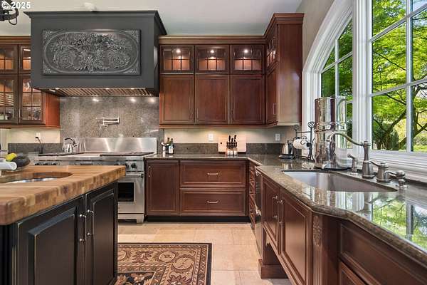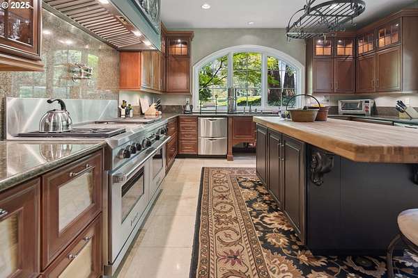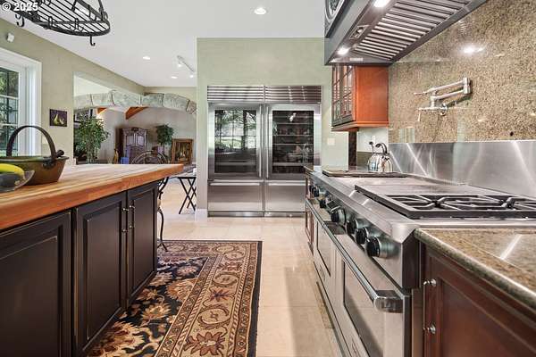 - Builtin Range, Builtin Refrigerator, Butlers Pantry, Convection Oven, Cooktop, Dishwasher, Disposal, Gas Appliances, Granite, Island, Microwave, Pantry, Range Hood, Stainless Steel Appliance, Tile, Wine Cooler