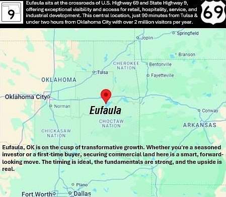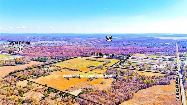 Up to 19.74 Acres plus Available along Premium development corridor - Highway 9 (WILL DIVIDE or COMBINE) with tracts as small as 1.4 acres and additional land up to 16.3 Acres. There is a 40x40 (1600sf) shop on site for storing vehicles and equipment - 1 mile SW of Eufaula along Highway 9 Prime Retail Corridor. 10,500+/- Vehicles Per Day. With its strategic location along a major highway and in close proximity to Eufaula, this property presents a unique opportunity for investors looking to capitalize on the growing demand for commercial space in the area. Whether you are looking to establish a new retail outlet, restaurant, or office space, this property offers the perfect setting to attract customers and drive business growth. 4" and 8" water line along Highway and 8" forced main sewer line. Power with CVEC. Come buy this in part or whole. Quick Access of US Route 69 to Oklahoma State Highway 9. Property has access off Highway 9. Within 3 Miles: 3,192 residents; over 1,400 households; Median HH Income of $44,166. This prime development land is strategically located near McDonalds, Braum's, Captain John's, OSU Extension Campus, Eufaula Dry Storage, Eufaula Municipal Airport, and McIntosh Fairgrounds in Eufaula, Oklahoma. Eufaula is renowned for its premium boating, fishing, trailblazing, picturesque sightseeing, and camping opportunities, all centered around Oklahoma's Largest Lake. Additionally, the upcoming Muscogee Nation Casino Hotel in 2025 will further enhance the area's appeal and potential for growth. GIS: 35.2901, -95.604