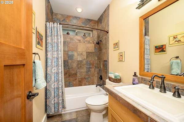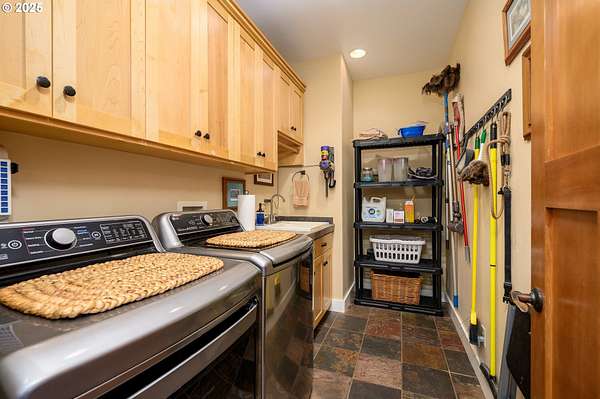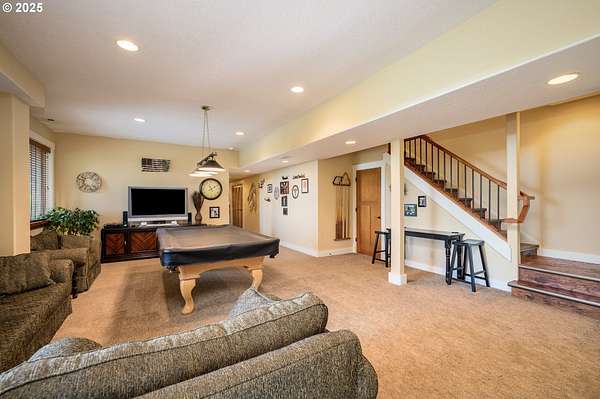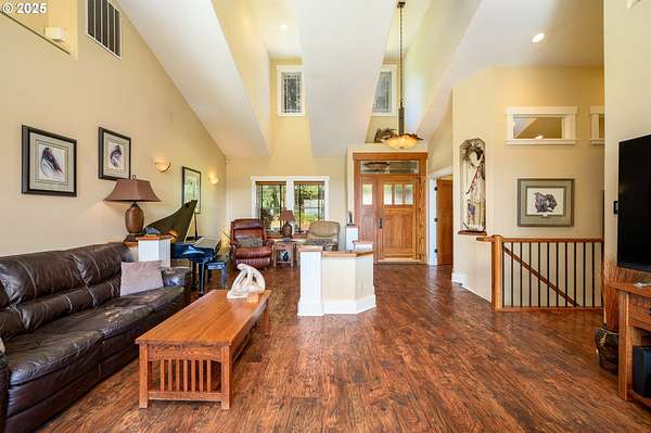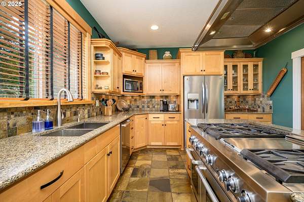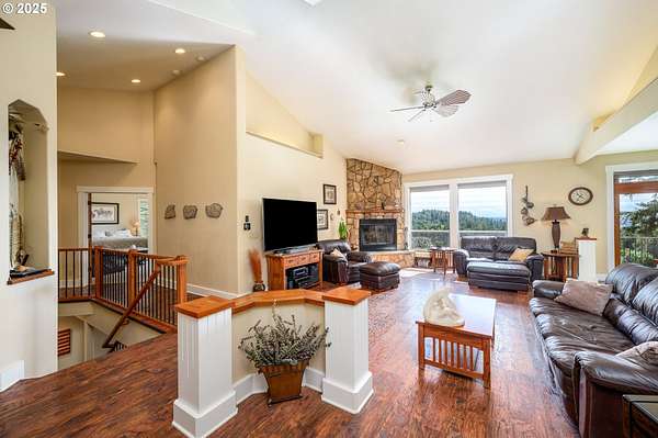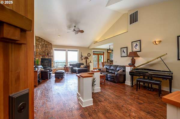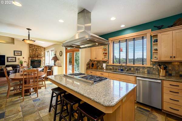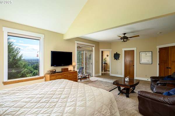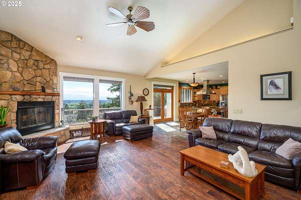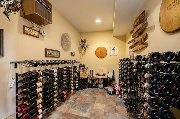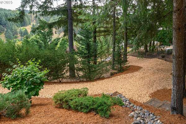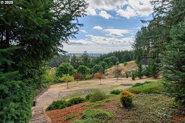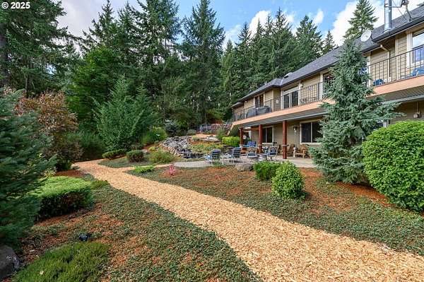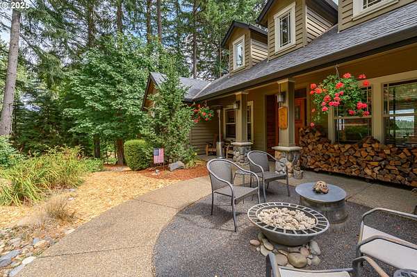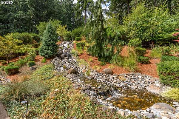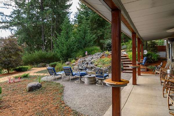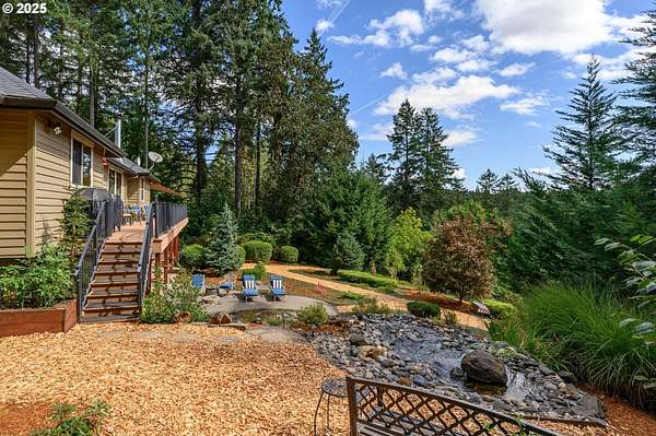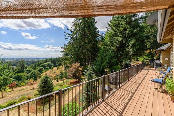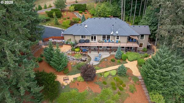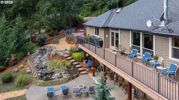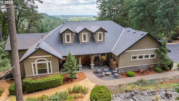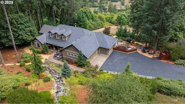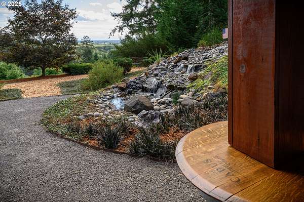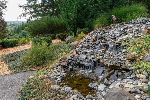 Blacktail Falls Resort, country living just outside of McMinnville. Meticulously maintained and beautifully updated. Front entry shows off with a custom built waterfall and gas fire pit to sit and enjoy the restfulness this property exudes. Timber framed grand entrance opens up to floor-ceiling windows next to a masterfully built rock fireplace which provides majestic valley and mountain views. An office and a cozy sitting area complete the entry leading to the living room. Vaulted ceilings with dormer windows bring in the light. French doors in dining area lead to deck that spans the length of the home. Plenty of room to entertain and enjoy. Chef's will be thrilled with the 6 burner gas stove, flat top and 2 convection ovens located in an impressive island. Granite counters grace the kitchen with room to create, bake and serve up your favorite dishes. View from the sink will make dish washing pleasant. Pantry, utility room and 1/2 bath lead to the garage for easy access unloading groceries. Main floor primary bedroom is an oasis with ensuite, walk-in closet and sitting area. Slider to private corner of the deck takes in the mountain and city views. Downstairs is a marvel of its own. Family room w/pool table, 2 bedrooms and full bath for living comfort. The awesome wine cellar has it's own cooling system. Crawlspace was converted with a wood floor to create approx 400 sq ft additional storage and lots of head room. The exterior makes outdoor living a dream. 2 custom built waterfalls use the surrounding landscape, boulders and trees in the best way. Along the walkway, a 60' long waterfall drops approx 25' ft into a rock rimmed pool. The back yard waterfall travels down a winding 25' path into a shimmering pool. 2 propane firepits to enjoy, entry and backyard. Upper deck has rain guards to protect the patio below. Posts with custom wine barrel bar tables make socializing fun and convenient. Dog run gives the puppies a place to enjoy the outdoors and stay dry.