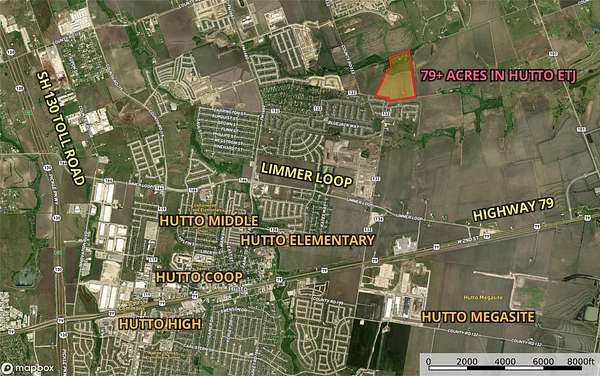79+ AG EXEMPT and UNRESTRICTED acres located in a high-growth corridor of Hutto, just 9 miles from the Samsung semiconductor facility in Taylor. Situated outside the city limits within the Hutto ETJ, the tract offers approximately 820'+ of frontage along CR 132. The land is primarily cultivated, with existing structures contributing no value. Utilities include nearby powerlines, an Encore meter, and an existing water well near the former homestead site. The Highlands North subdivision lies across the county road and is served by Jonah Water and Hutto Wastewater. The South Fork of Mustang Creek traverses the northern portion of the property. Currently under a farm lease and located within Hutto ISD. Hutto continues to see sustained growth due to its strategic location along SH 130 and US 79, positioning it within the path of Central Texas expansion. Proximity to Samsung in Taylor, Dell Technologies in Round Rock, and the broader North Austin technology corridor supports increasing residential demand, commercial activity, and long-term investment fundamentals. Buyer to independently verify all information, including but not limited to zoning, land use, exemptions, easements, restrictions, utilities, and development potential.