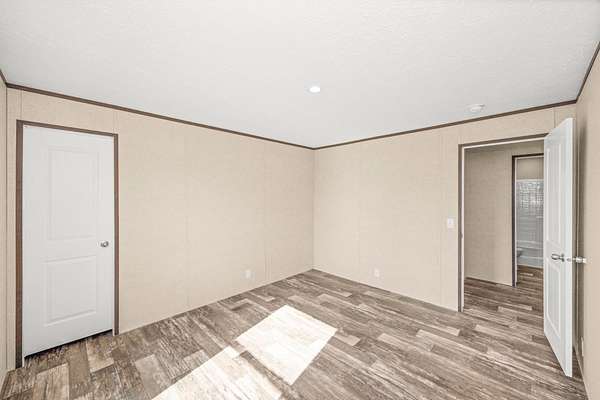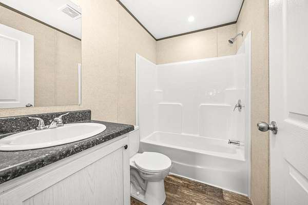 The split-bedroom floor plan offers privacy and flexibility. The primary suite is generously sized and includes a walk-in closet and a private bathroom with double vanities and a tub shower combination. Additional bedrooms are well proportioned and share a modern secondary bathroom, making the layout ideal for guests, family members, or a home office.