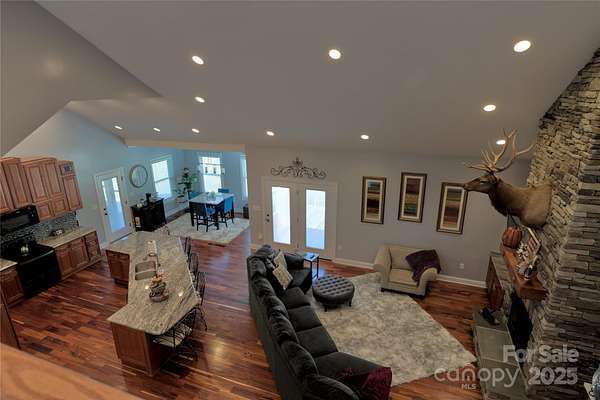 Over 4 1/2 acres and no HOA! A rare gem in Huntersville. Country living at its best. Custom build with high end finishes including gorgeous granite in kitchen and all bathrooms. Brazilian hardwood flooring throughout the main level. Kitchen has large island and custom cabinets with an open floor plan including dining area, living room, stone fireplace with gas logs, built in shelving and high ceilings. Large screened porch beside kitchen for entertaining. Upstairs is a loft area for an office or playroom with storage on either side. One side is already plumbed for a bathroom. Outside is beautiful and private a large deck looking over the wooded backyard with fully stocked pond. Irrigation system, gated entrance. This property also boasts a detached 5 car garage AND a massive steel outbuilding with over 3000 sq ft. perfect for collectible autos, auto shop, workshop or tons of storage. 2nd Living Quarters attached including 2 bedrooms, full kitchen and a full bath for all of your guests and family. Parking for boats, RV's, ATV's. Come see this one of a kind custom home and property waiting for your Buyers!