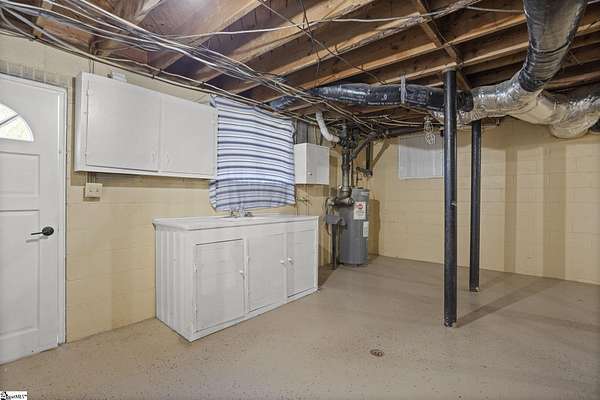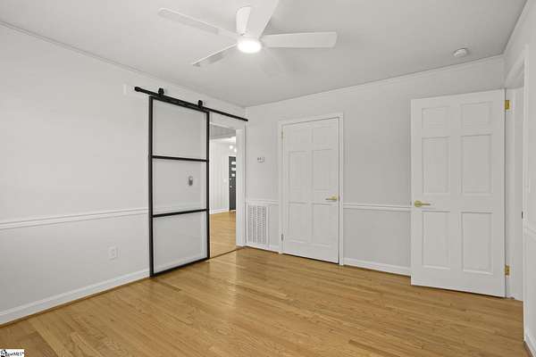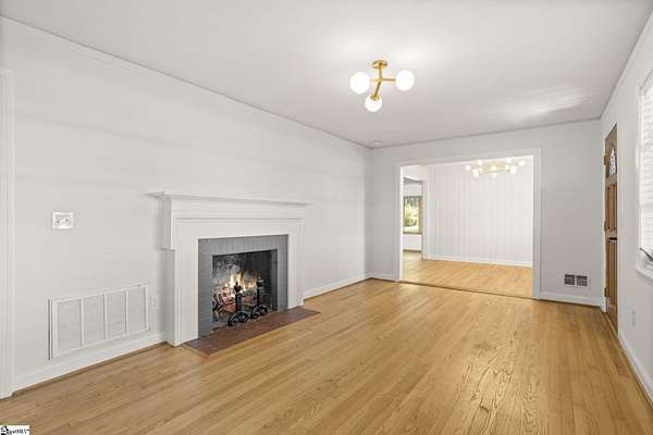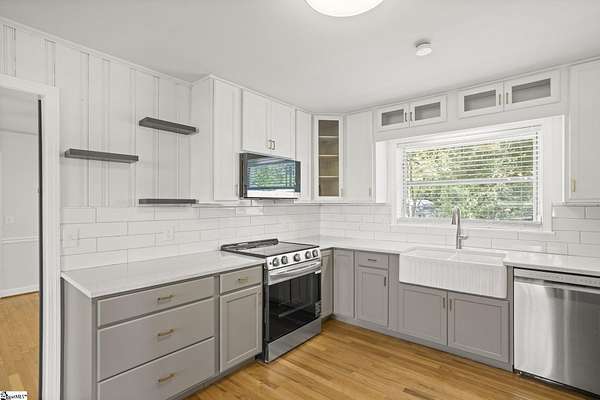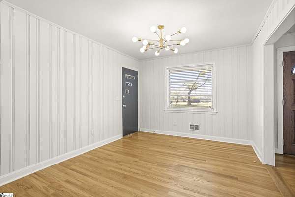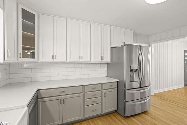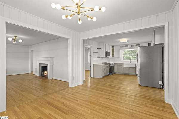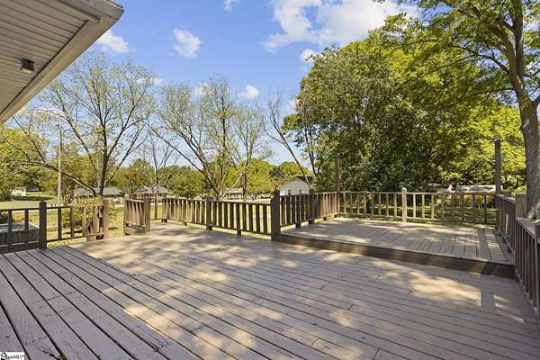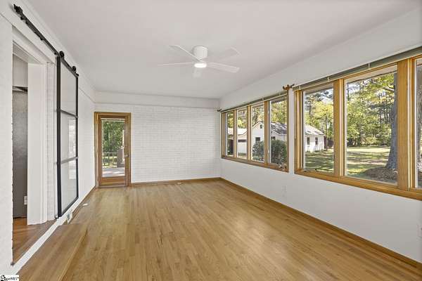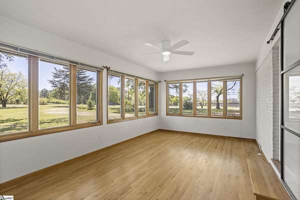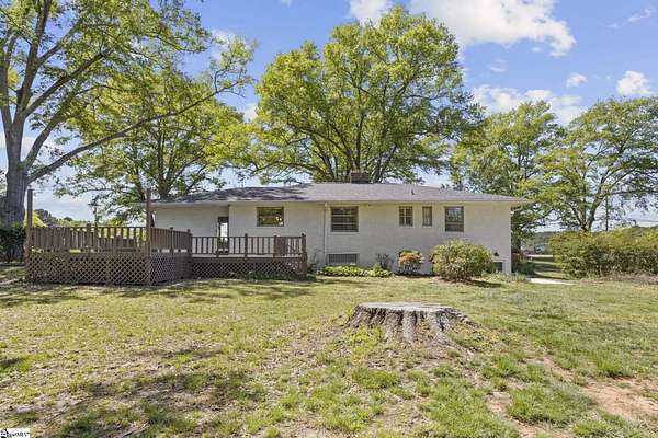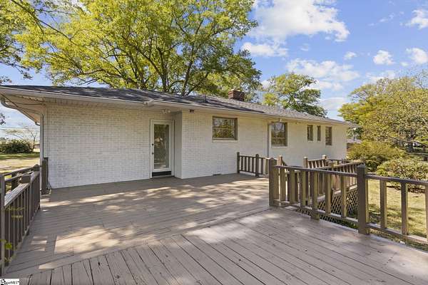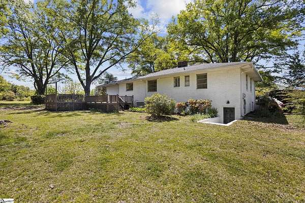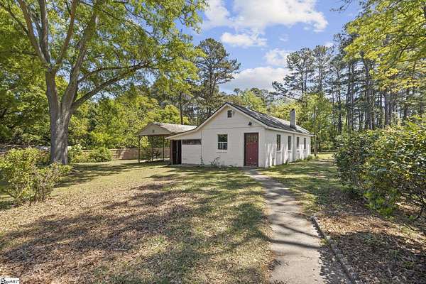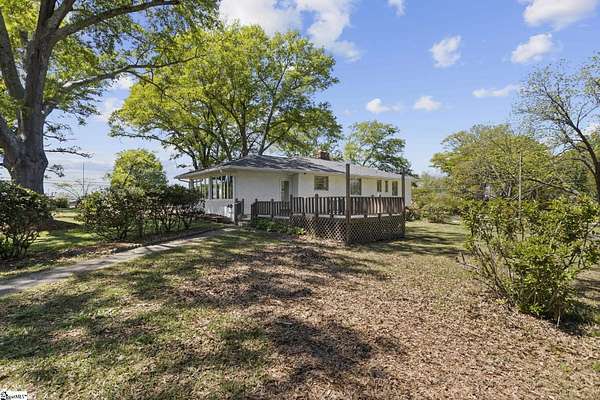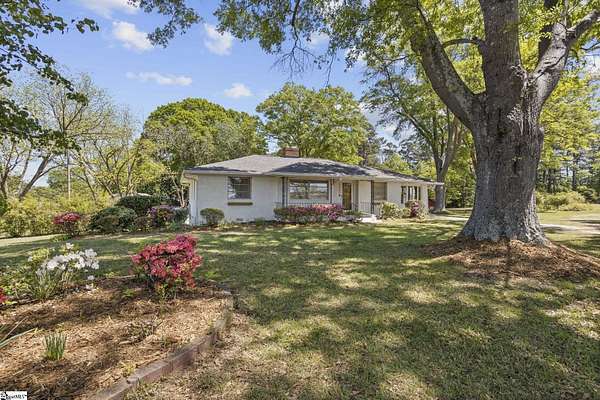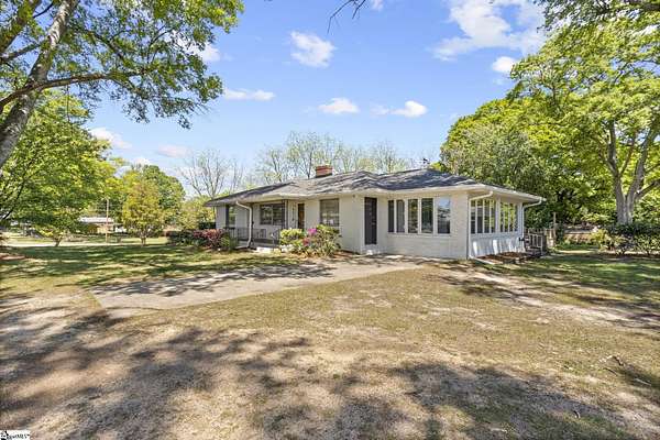 Gorgeously updated, newly painted mid-century home on 1.75 acres AND conveniently located just minutes from downtown Greenville, shopping, parks, and dining! Welcome inside to the main living area that features a wood-burning fireplace and beautiful hardwood floors that flow into a dedicated dining space. The fully renovated kitchen includes quartz countertops, farmhouse sink, soft-close cabinetry, and stainless steel appliances. A bright sunroom lined with windows provides additional living space and access to the 24x24 oversized deck overlooking a wooded backyard. Downstairs is an unfinished partial basement with a separate entrance, providing additional storage or living space. This home also provides a large workshop with a covered space for boat or RV parking. Major updates include HVAC (2020) and new roofs on both the home and workshop (2023). This home is located in a USDA eligible location! Call Bruce with questions at 864-313-3606.
