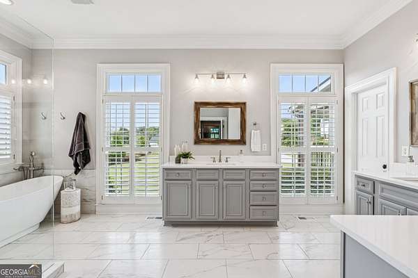 - Central Vacuum, Double Vanity, Entrance Foyer, High Ceilings, Master On Main Level, Separate Shower, Soaking Tub, Tile Bath, Walk-In Closet(s)