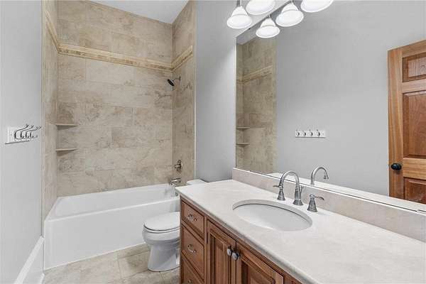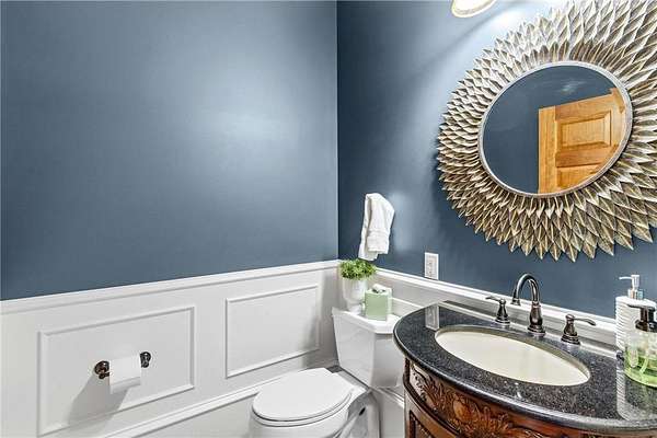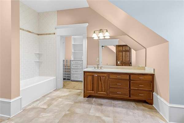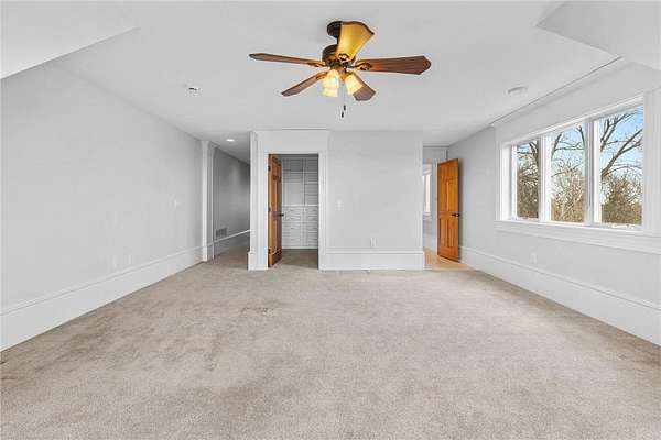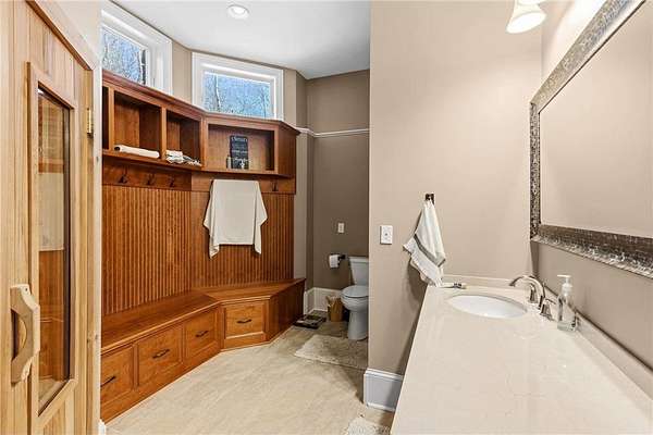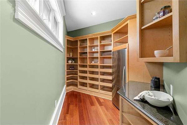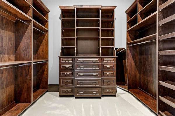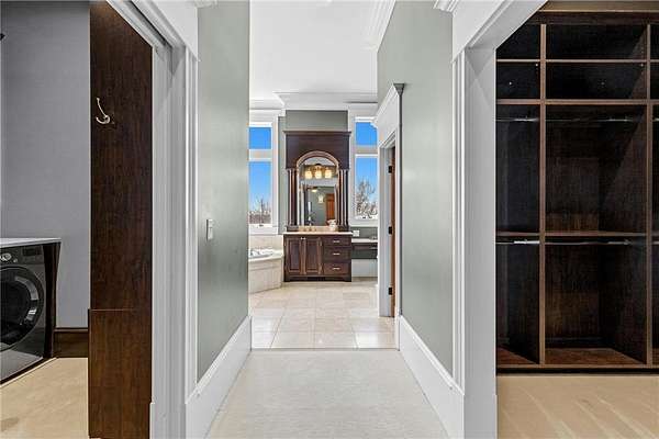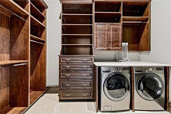 Walk-in closets with built-in organization systems are found throughout. The primary suite offers a private retreat with dual walk-in closets, its own dedicated laundry room, and a spa-style bath with in-floor heat.