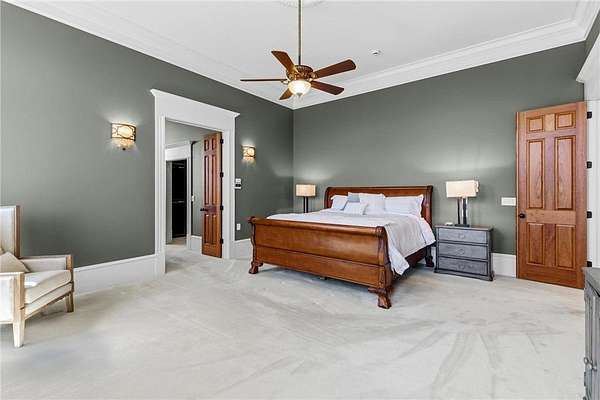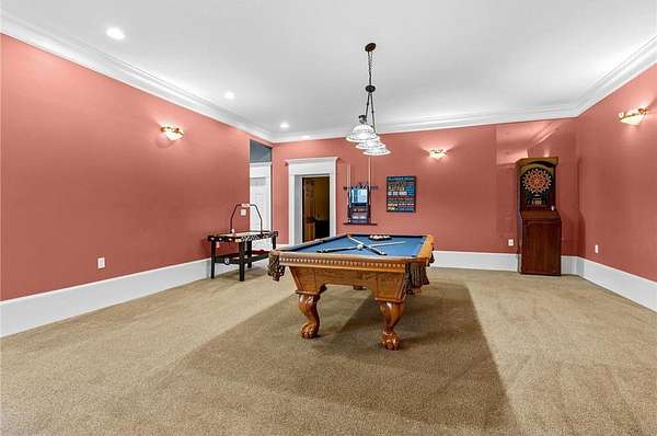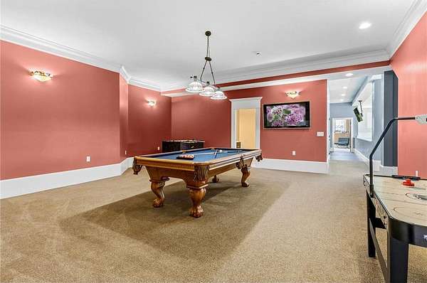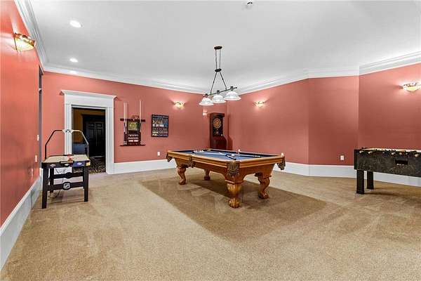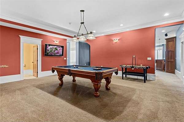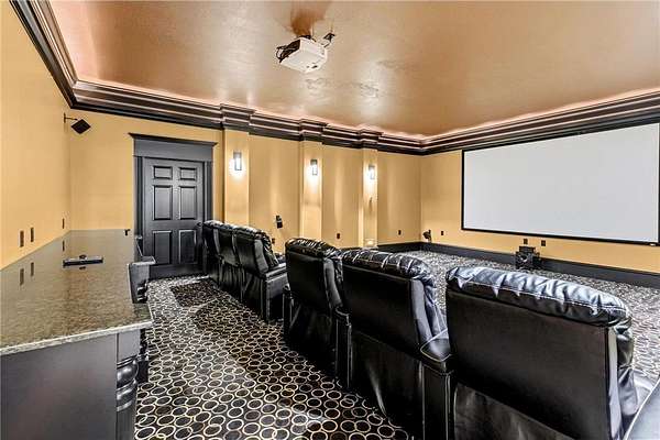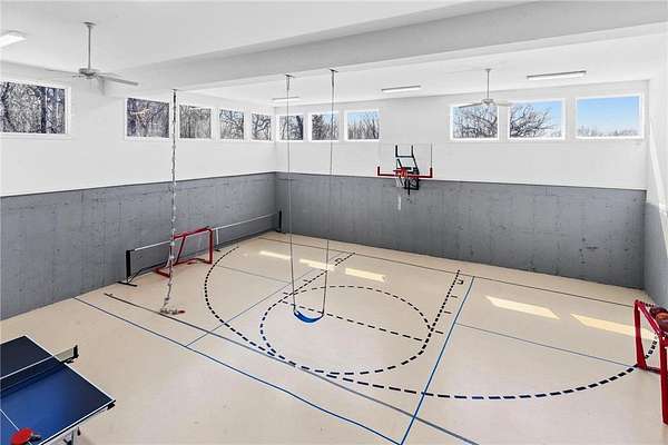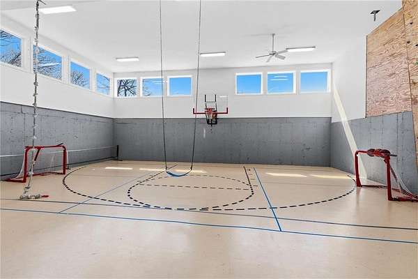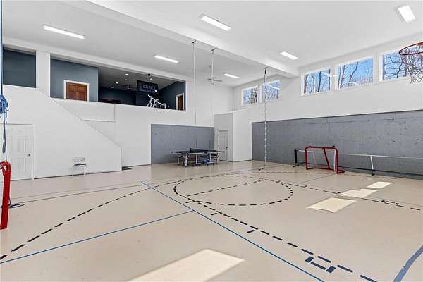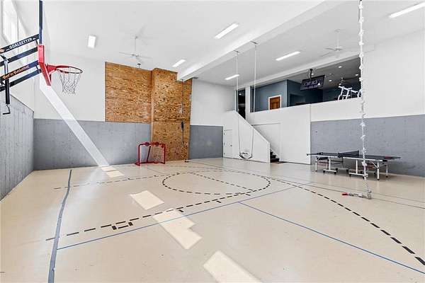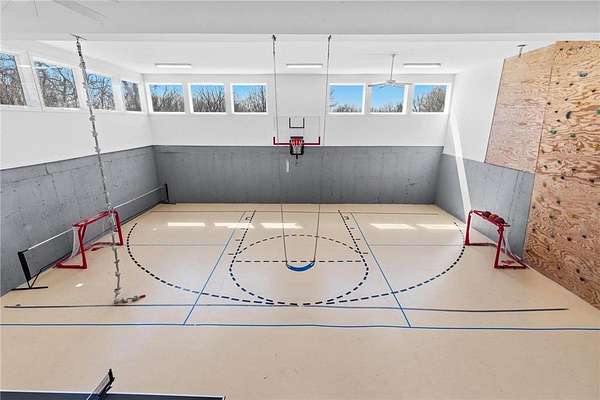 A 41' x 41' indoor gymnasium with 18-foot ceilings, basketball hoop, and climbing wall provides a rare recreational feature. The attached 5-car garage includes Level 2 EV charging. This home also features an elevator shaft for future installation.