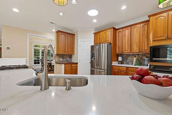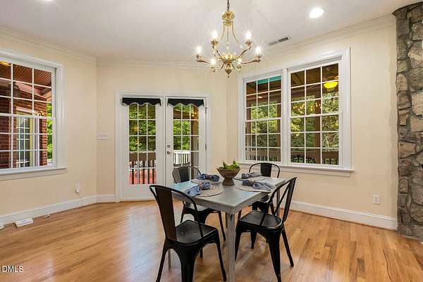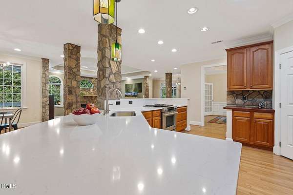 Gorgeous brick walk-out basement home on 1.69 very private wooded acres in highly sought-after River Oaks! The spacious side-entry garage and classic curb appeal are complemented by modern updates including a 2021 roof, 3 HVAC units (2024, 2022, 2011), and Ring security cameras. Inside, the home showcases hardwood floors throughout the main level, and electric remote-controlled EcoSmart window shades in the office, dining room, and primary bath. The gourmet kitchen features 2 ovens, new quartz counters, stainless appliances, a Solatube skylight, center island, veggie prep area, and walk-in pantry. Relax in the family room by the stone-surround fireplace. The main-level owner's suite offers a spa-like bath (remodeled 2022) featuring Hanex solid-surface shower and counters, a free-standing tub, walk-in shower, and private deck access. Additional features include a formal dining room, home office with built-in storage and bench, and two spacious bedrooms sharing a Jack-and-Jill bathroom. The beautifully finished, walk-out basement offers a wet bar with dishwasher, bonus room, a full bath, flex rooms, room suitable for wine storage, workshop with built-in benches and plenty of storage has endless possibilities for hobbies or maybe home business. Whether you're a nature lover, being in it or just enjoying the view, or a gardener enthusiast you will love the serene picturesque outdoor living which changes with the seasons. This home offers a screened porch with luxury vinyl floors, an expansive tiered deck, gas line for grill, spacious lower covered patio wired for hot tub, fenced yard, and irrigation system. Enjoy community amenities: pool, clubhouse, tennis, and pickleball, with easy access to area parks, Falls Lake, WakeMed North Hospital, shopping, US-1, and I-540! For those who love a quick stroll to restaurants, Brixx wood-fired pizza, Mamacita (Mexican cuisine), Bowlba Cafe, and River Pub are nearby.