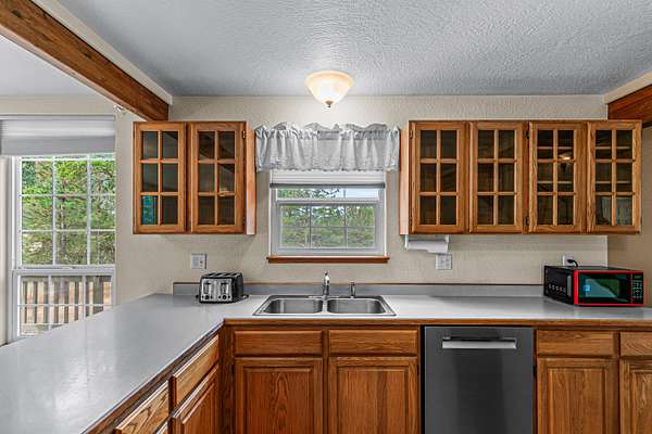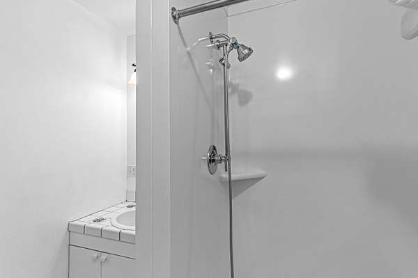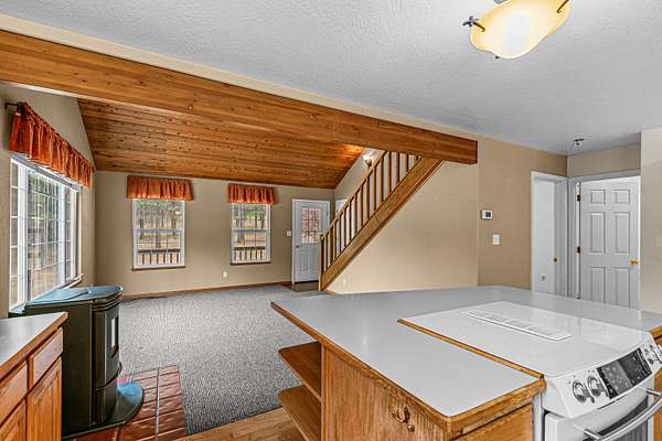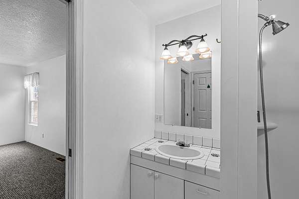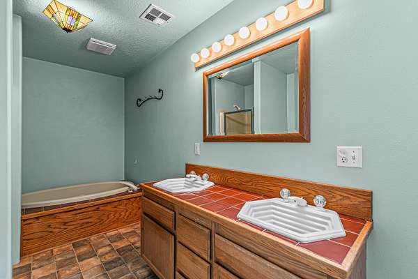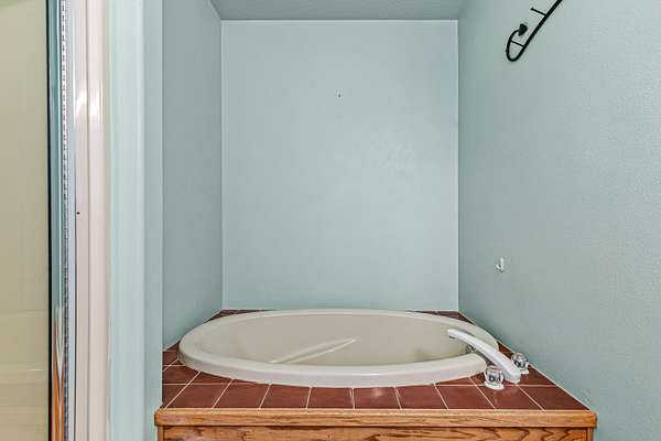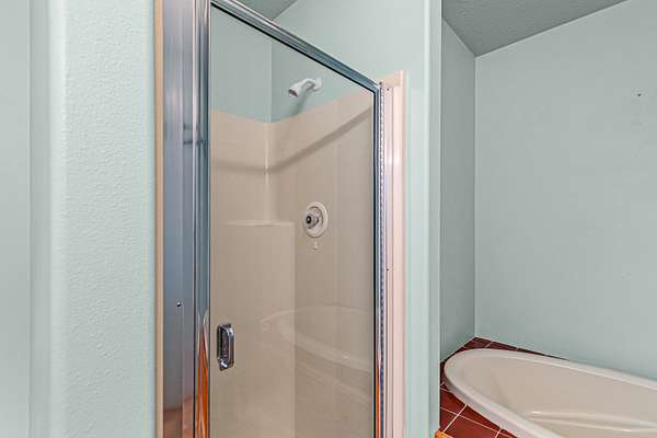 - Breakfast Bar, Built-In Features, Double Vanity, Fiberglass Stall Shower, Kitchen Island, Linen Closet, Open Floorplan, Primary Downstairs, Shower/Tub Combo, Tile Counters, Vaulted Ceiling(s)