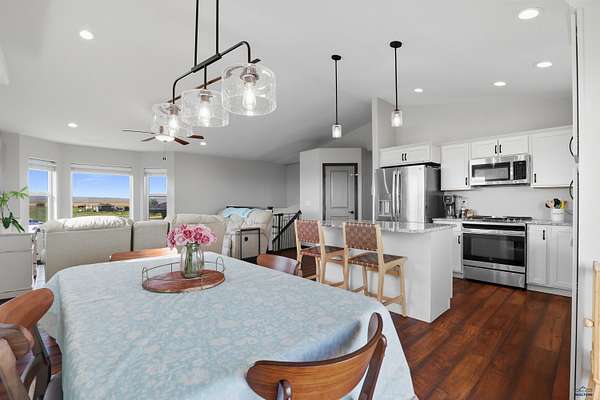 Listed by Cody Brown, Engel & Voelkers Black Hills, 402-910-3553. Split-foyer single family home in the Royal Run subdivision, situated on 3.6 acres and built in 2020. The upper level features an open concept living room, dining room, and kitchen, along with the primary suite which includes a private bathroom and walk-in closet. There is one additional bedroom and one additional full bathroom on the upper level as well. The lower level includes a spacious family room, two more bedrooms, and another full bathroom. The upper level walks out to a deck with steps down to a stamped concrete patio, an additional concrete pad, and a custom concrete firepit. The yard surrounding the house is fully fenced with a privacy fence for added enjoyment and peace of mind. Horses are permitted on the property, offering great flexibility for rural living while still being close to town. New roof as of 11/2025!