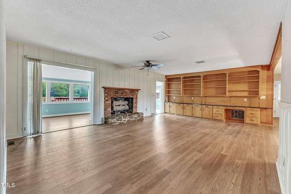 - Bathtub/Shower Combination, Beamed Ceilings, Bookcases, Built-In Features, Ceiling Fan(s), Laminate Counters, Natural Woodwork, Open Floorplan, Primary Downstairs