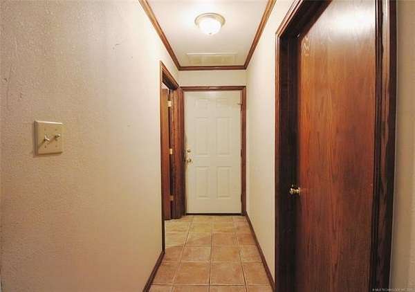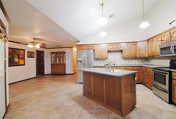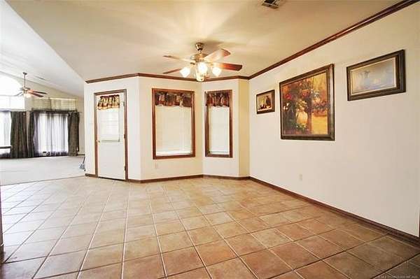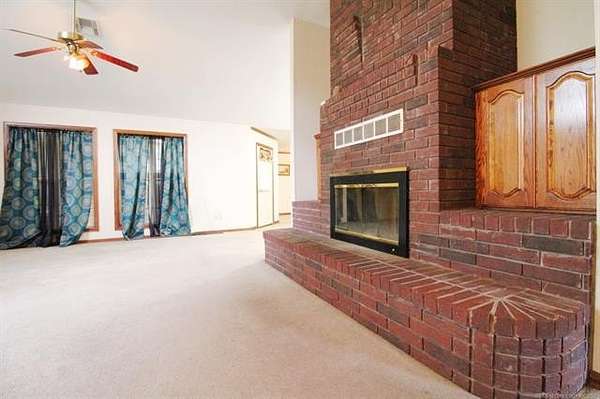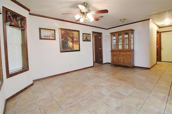 Spacious 3-bedroom, 2-bath brick home with an office that could serve as a 4th bedroom. This property features a large living room with a beautiful brick fireplace and vaulted ceilings, creating a warm and open atmosphere. Enjoy the convenience of a 2-car garage and a built-in safe room for added peace of mind. The covered front porch is perfect for relaxing and taking in the views of the 2.5-acre setting. Located outside city limits on a paved road, this home offers the perfect blend of country living and easy access to town. Students have the choice of attending Okmulgee or Morris Schools.