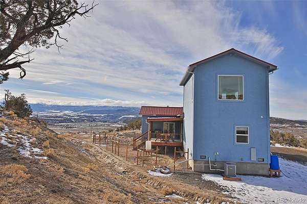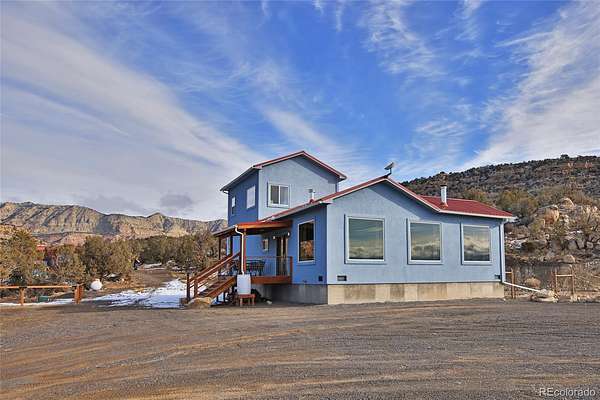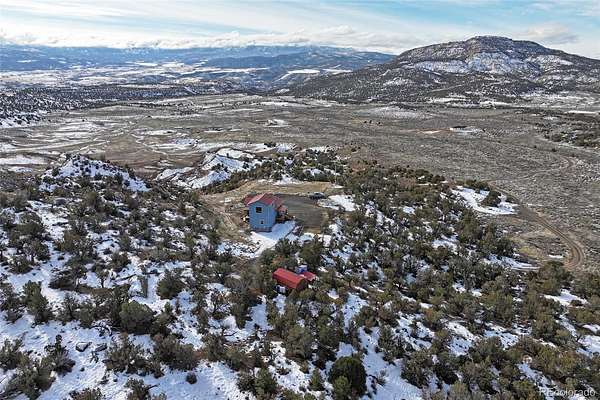 Stunning 2173 sq ft home built in 2020 on 40.16 acres bordering BLM (3,000 acres of public land) on the north and east side for sale in Mesa. This beautiful home is surrounded by vast mountain and valley views in quiet privacy and Colorado outdoor recreation in every direction. Leave 45 ½ rd and travel a winding graveled lane with scenic views, along the cedar tree lined circle drive to this gorgeous 2 story, 2 bedroom, 1 bath home amid natural terrain grasses, rock and cedar trees. Wildlife of all kinds can be spotted on or near the property and the views are unsurpassed. Covered deck entryway leads to the gorgeous lead embellished french doors with ornate fixtures. Step into the open concept area with vaulted ceilings, engineered hardwood floors, large windows with natural light and magnificent views of Powderhorn Ski Resort and Grand Mesa National Forest. Remote controlled ceiling fans, energy efficient recessed lighting, and wood stove all add to the cozy atmosphere giving a spacious feel and plenty of room to entertain or relax in. Fix a meal or snack in the state-of-the-art Chef’s kitchen with stainless steel updated appliances-gas range with hooded vent, split door refrigerator, dishwasher, deep farm style sink with racks and retractable spray faucet. Also included is a microwave, wood cabinets, pantry, maple butcher block countertops with breakfast bar seating. After a long day at work or mountain play enjoy the enclosed massage steam whirlpool bath/shower with computercontrolled program settings for a luxurious experience in selfcare complete with bluetooth availability. Laundry room with stackable stainless steel GE power steam washer/dryer are included. Spacious guest bedroom with carpet, ceiling fan and walk in closet with shelving and racks are on the main floor. The master bedroom retreat is on the upper level with carpet, large windows to enjoy the glorious views and includes a small sitting area for an office or any other need.