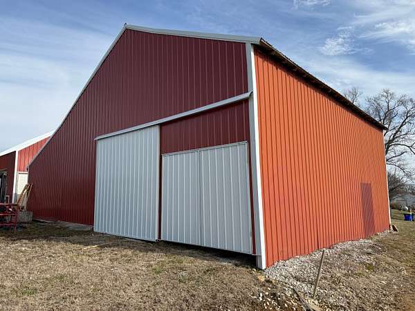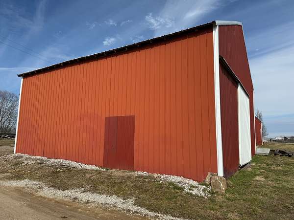 56' x 36' pole barn with metal siding and a full concrete floor. Equipped with three overhead roll-up doors (two 9'W x 8'H and one 14'W x 10'H), plus 200-amp electric service, making it well-suited for wood-working, automotive repair, machinery, or commercial use.