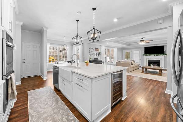 Inside, the completely renovated home features a spacious kitchen with plenty of counter space and cabinetry, a pot filler, gas cooktop, double ovens, and a huge island, making it ideal for cooking, entertaining, and everyday living. The thoughtful layout offers comfortable living spaces and plenty of room to gather.