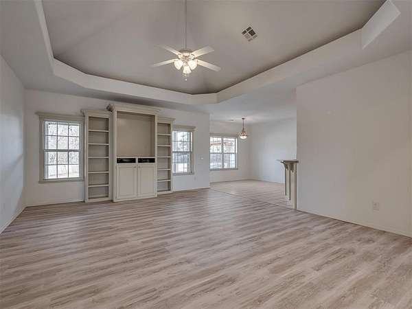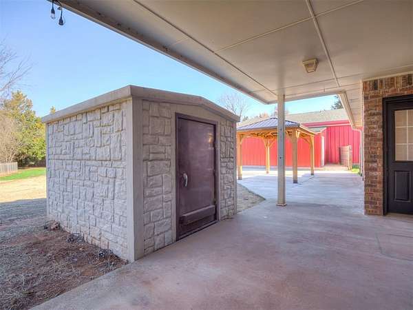 Looking for land, a spacious home AND a shop? Check out this 3 Bed, 2 Bath, 2 Dining home featuring new laminate wood flooring, interior paint & the roof is approximately 3 years old. Cute built-in hutch in the formal dining, & up-lighting in the large living room help make it feel like home. Kitchen has breakfast bar, spice storage cabinet by the refrigerator, and good size pantry in the hallway. The primary suite is large enough for your king size furniture, tray ceiling w/recessed lighting & ceiling fan, full bath w/double vanity, linen storage, separate tub & shower, & a walk-in closet. This 2 acre+/- property also features a flag pole, covered patio w/storage closet, easy access walk-in storm shelter AND a 2nd inground storm shelter, extended patio w/wood pergola, 24x46 shop has bathroom w/shower & an additional lawn equipment garage.