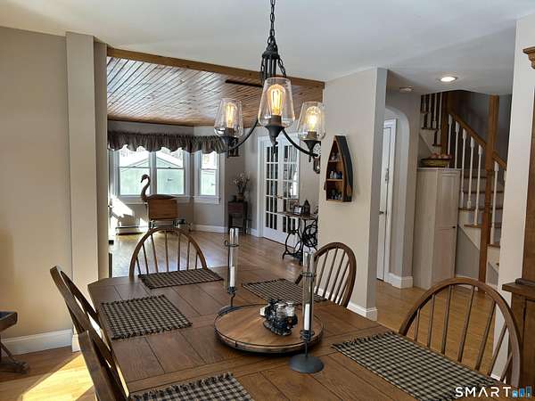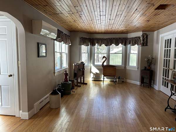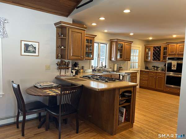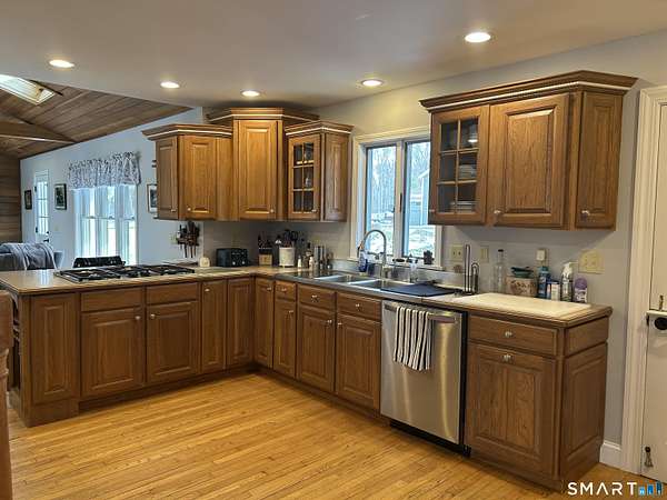 Located on open 1.8 acre parcel, this beautiful cape home offers many features. The front entrance opens to the living room and dining room on either side. Off of the living room through french doors, is an office/den with built in shelving. The kitchen is open to the cozy family room with vaulted ceilings and wood stove. Also on the first floor is a full bathroom. The 2nd front entrance brings you into a mudroom area with slate floor, storage closets, inside access to the garage and 2nd stairwell to the upper floor. The primary bedroom is inviting with its gas fireplace, full bath and walk in closet. The 2nd bedroom has ample closet space and full bath. Also on the 2nd floor is a 3rd bedroom, full bathroom with open tub and built ins, and office/loft area overlooking the front yard. Off of the two-car, attached garage is a screened in patio. Additional features include owned solar panels, Buderus furnace and generator. One fantastic feature is the detached oversized garage/workshop with 12' overhead door, heat, electricity and separate driveway.