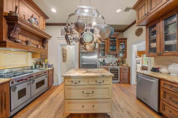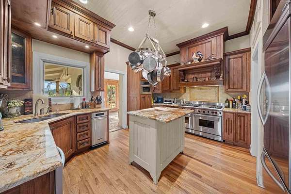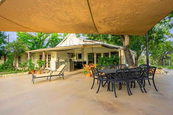 Rock Haven Ranch is the most peaceful blend of rich history and tantalizing panoramic views. The original rock portion of the home was built in 1862 and over the years additional rooms were added as needed. The "L" shaped home now offers a workshop, office and library in addition to the traditional living areas. The owner says that library was once the original kindergarten building for the Comfort area. Outside you will have ample space to spread out under the 1,700 sq ft of porch. The tiered patio is largely made up of the beautiful natural bedrock that has been tastefully revealed to provide the picture perfect place to sit and enjoy a meal while watching the breathtaking sunsets. When it comes to preparing the meals the home offers both indoor and outdoor kitchens as well as a screened in BBQ room for those who love to enjoy the fresh air as they cook. There is an in-ground rock tank for holding water that was once transformed into a unique swimming pool that could be revived. Behind the home is an additional stand alone 1,000 sq ft workshop that houses the water storage tank.