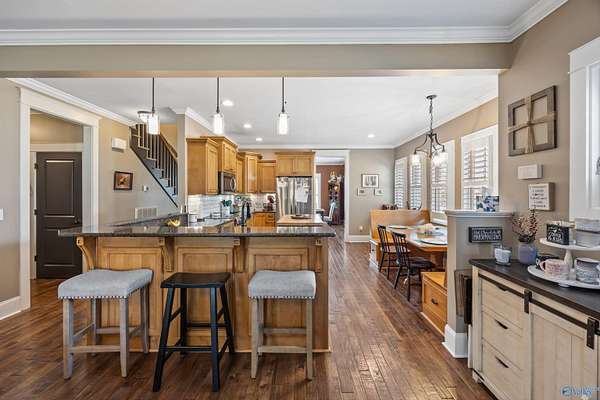 Stunning custom-built craftsman style home set on 1.58 beautifully landscaped acres, offering exceptional curb appeal and timeless character. This home features hardwood floors throughout with tile in wet areas, an elegant living room with fireplace and custom built-ins, and a gourmet kitchen complete with granite countertops, large island, and built-in seating. The spacious primary suite is located on the main level, with additional bedrooms upstairs and a versatile bonus room or office that can serve as a fourth bedroom. Expansive front and back porches provide ideal spaces for relaxing or entertaining. A 36x40 detached garage adds outstanding storage and functionality.
