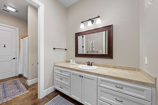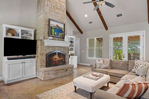 This is the ideal family home for those who love to entertain & enjoy spacious living! Nestled in The Horizon, a gated game preserve just south of Kerrville, it provides seclusion & privacy while being just 5 minutes from schools, restaurants, shopping, entertainment, & restaurants. This beautifully designed Hill Country home offers an open concept & spacious, light-filled layout with large windows & an upscale kitchen that opens to the great room with vaulted ceiling, a stone fireplace w/ custom iron screen & built in cabinetry. The large covered back patio is ideal for relaxing, BBQs, and enjoying stunning southern views, which can also be admired from the hot tub. The property includes an RV barn/shop with four large automatic doors, perfect for storage, projects, or hobbies, & even features an air-conditioned workshop. Surrounded by mature Oaks, the home is private and cannot be seen from the road. Whether you're looking for a full-time residence or a winter retreat, this property is a rare find in Kerrville. With a community water supply and its own well with a storage tank, you'll have the best of both worlds. A unique opportunity for Hill Country living!