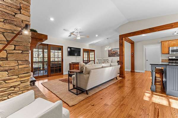 Whether you're searching for a full-time mountain retreat, a relaxing weekend getaway, or a smart investment property, this beautiful 3-bedroom, 3-bathroom home offers effortless mountain living with all the comforts of modern life. Perched at over 4,000 feet elevation on 1.69 acres, this property combines privacy and natural beauty with easy access to all that Cashiers has to offer. Enjoy the lush, professionally landscaped grounds filled with native plants, and a fully fenced yard-perfect for pets or play. Step inside to a bright, open living space centered around a striking stone gas-log fireplace. The living room opens through double glass doors to a screened-in back deck, where you can sip your morning coffee while taking in serene views of the forested backyard. The kitchen features a welcoming island for casual meals and connects seamlessly to a dining area ideal for gatherings with family and friends. A convenient laundry room just off the kitchen leads to one of the home's two garages. The primary suite, complete with an ensuite bath, is located on the main level along with two guest bedrooms and a full guest bath-making main-level living simple and comfortable. Downstairs, you'll find a spacious family room that opens directly to the fenced yard, creating a perfect space for movie nights, game days, or simply relaxing. The lower level also includes a full bath, a workshop/storage area, and access to the second garage. Just minutes from the dining, shopping, and entertainment options of downtown Cashiers, yet tucked away for peace and privacy, this home is a rare blend of mountain charm and everyday convenience.