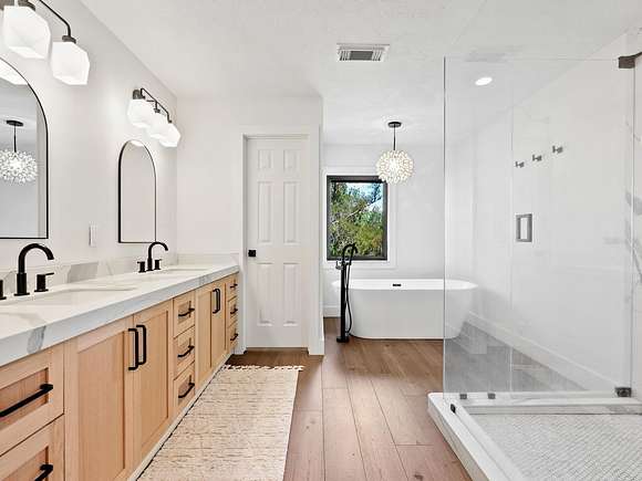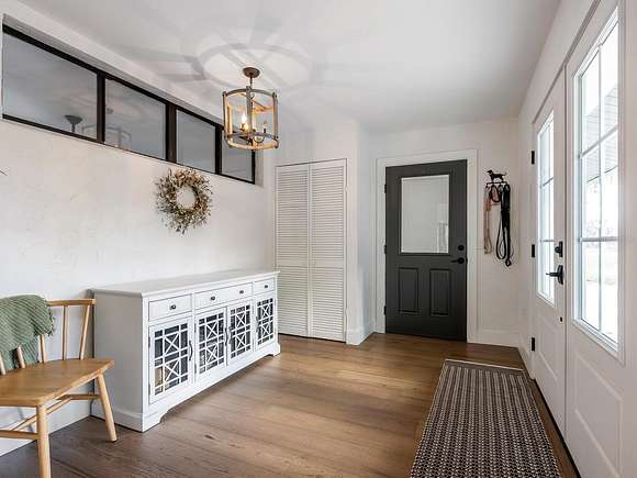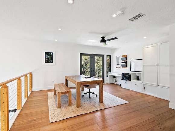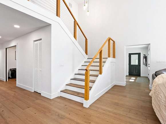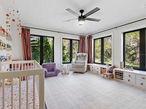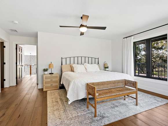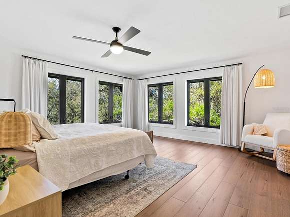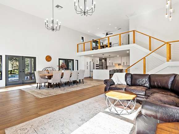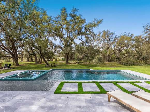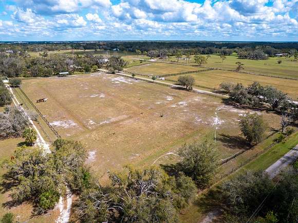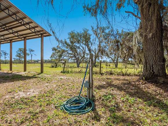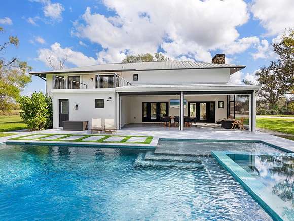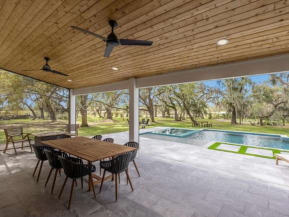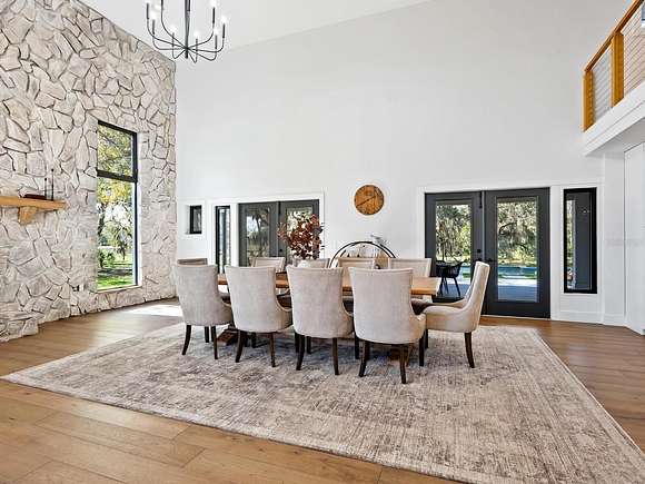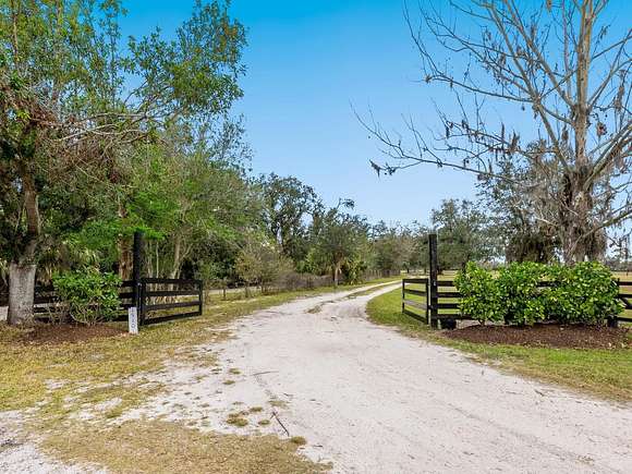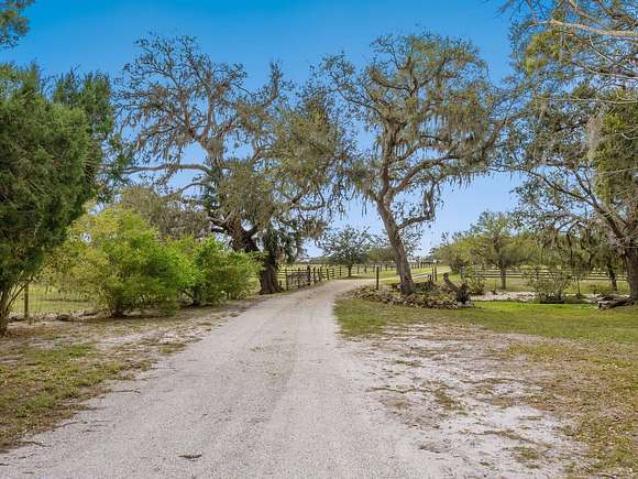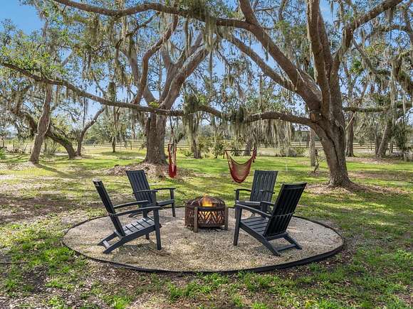 Minutes from the Fruitville Road corridor, take a short scenic drive down canopy roads and arrive at a once-in-a-lifetime farmhouse estate. This country home is among century-old oaks and sits on 18 breathtaking acres. The newly renovated three-bedroom, three-bath, three-car garage home, provides open-concept living with vaulted ceilings, hardwood floors throughout, a wood-burning fireplace featuring a whitewashed stone wall. The crisp and beautifully designed kitchen has a simple aesthetic and boasts newer Cafe appliances, a center island and composite stone counters and backsplash. Connected to the beautiful kitchen is a spacious walk-in pantry and around the corner, herringbone-laid brick floors enhance the laundry room and side entry door foyer. Cable rail lines the staircase to the second-floor loft, utilized as a home office, but flexible options could be a den, home gym or enclosed for a fourth bedroom. The primary suite is a retreat all on its own, spacious and inviting with two walls of windows overlooking wooded privacy, a generous walk-in dressing room and closet with custom built-ins and glass door cabinetry. The primary bath is a luxurious, inviting space with soaking tub, dual sinks, glass enclosed linen closet and separate shower with marbled porcelain tile. Outside, the best of a country lifestyle continues. In 2023, an inviting new pool and spa was built, surrounded by marble decking and sited next to the lanai with retractable screening. A covered, partially enclosed grill and smokehouse room, makes barbecuing easy come rain or shine. This home is a horse lovers dream. Ramm Flex Fencing around six acres and three pastures was installed 2021, and with a 30-year warranty, it's practically maintenance free. Two pole barns, one just built in 2022, provide covered storage for equipment and gear, plus two oversized stalls could easily be converted into four stalls and the nearby RV hookup has water and electricity. At the end of a long day, whether you've been working the land or working in the office, you will love kicking back here. It's hard not to fall in love with all this amazing home and land has to offer!