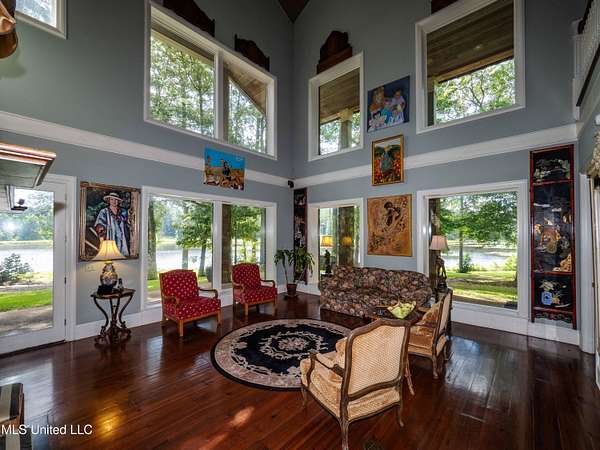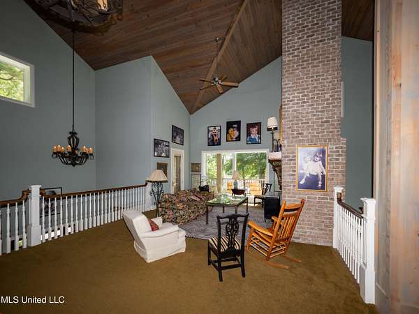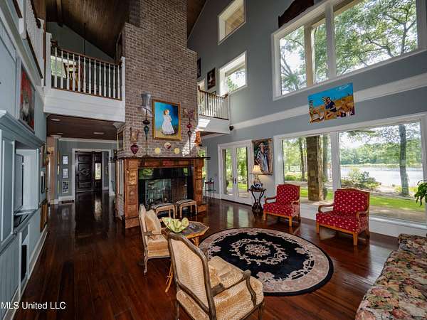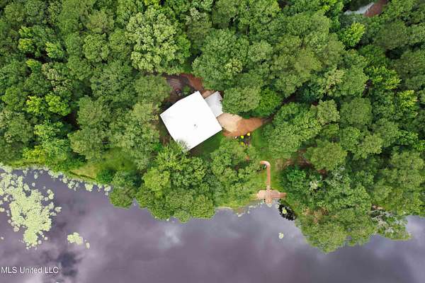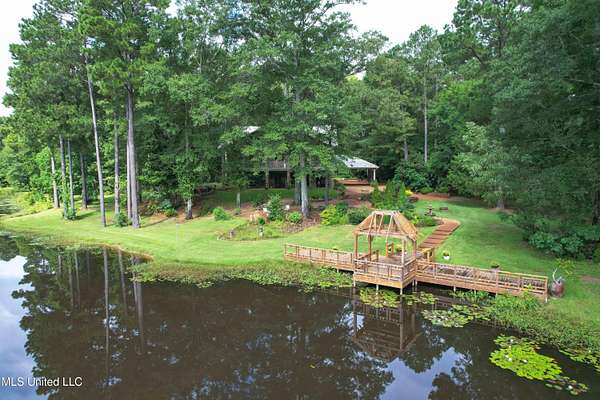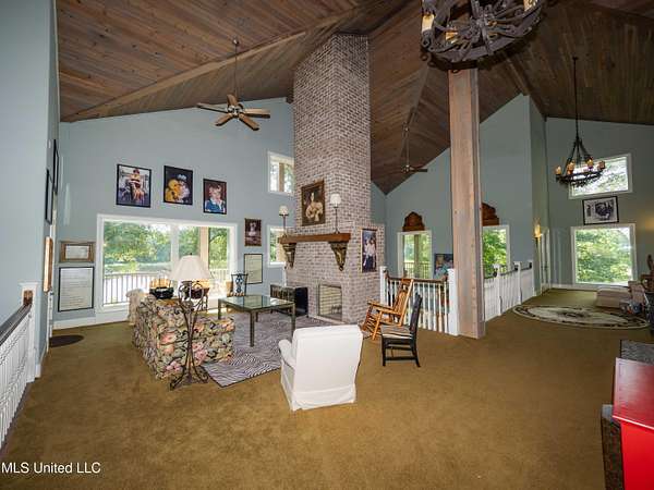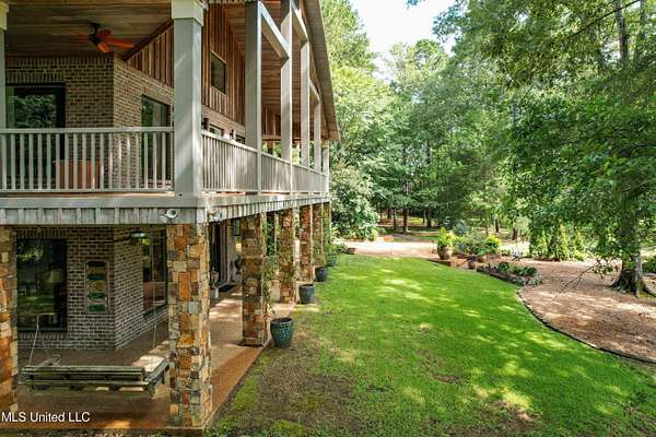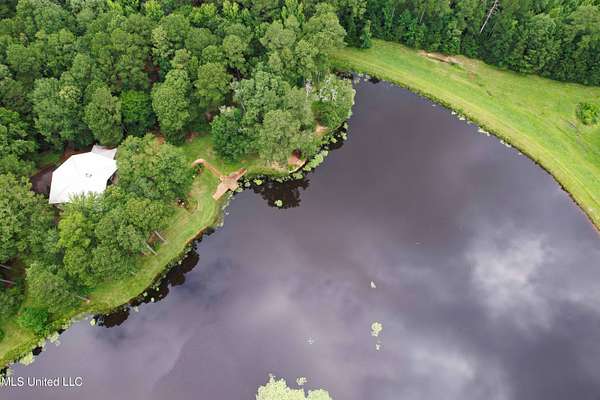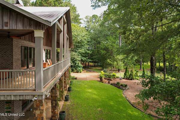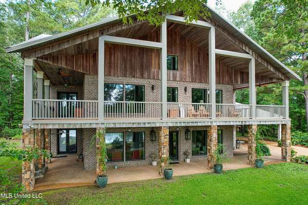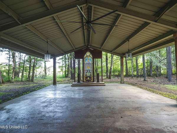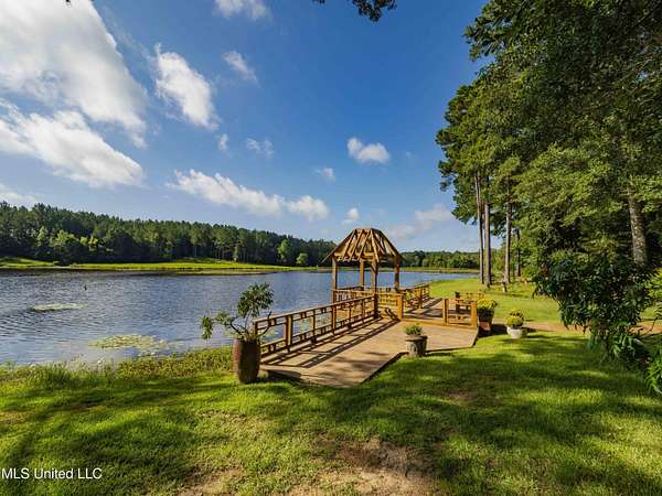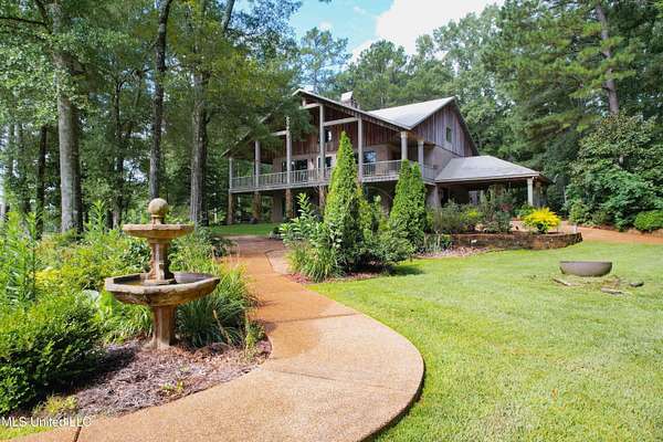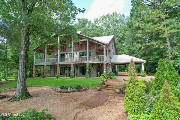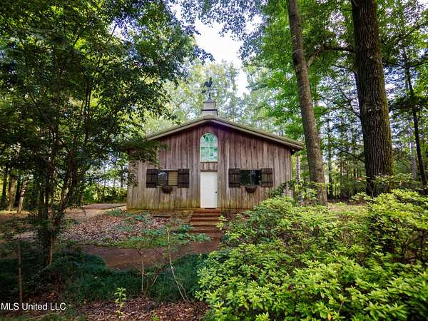 Built in 2007 this Residence was featured in Mississippi Magazine's September/October 2010 issue. Since 2014 it has served both as a primary residence and a wedding venue with approximately 40 weddings held at the property. Located south of Florence Mississippi, this property is approximately 58 acres. The gated entrance leads to an 11-acre lake, a 4980 square foot main residence, and a 30 x 90-foot Chapel. The main house has a unique 4-gabled, or cross gable roof system. This allowed the use of large windows in all living areas which create beautiful views of the lake and property throughout the home. A wrap-around porch outside the first floor living area compliments the wrap-around balcony on the second floor. From the three-car carport you enter the home to a large open staircase and foyer. The first guest bedroom and bath are to your right. Beyond the foyer is a beautiful gourmet kitchen with a large island overlooking a dining area. The kitchen boasts a double oven and warming drawer, microwave, separate sink and dishwasher, six burner gas cooktop, island with double sink and a large built-in refrigerator. The pantry has a separate freezer, a second dishwasher, sink, wine cooler and cabinetry with ample storage. The dining area is highlighted by a large window overlooking the lake. The ceiling is wood planking. From the kitchen/dining area you walk into the main living area. The beaded cypress ceiling towers 34' above you and the second floor is open to the room. The massive double fireplace is visible all the way to the ceiling, and you are surrounded by large windows with spectacular views of the lake and porch on two sides. From the main living area, the large second floor windows mirror the first-floor windows. Light filters through them from the surrounding trees. You can see the overhang of the wood planked second floor balcony ceiling with its gable roof as well. At the end of the main living area is the entrance to the primary bedroom with fireplace and his and her bathrooms. The main bathroom has a large walk-in closet, makeup area, large vanity and sink, jetted tub, and laundry room for the washer and dryer. His bathroom has a walk-in shower and a closet that also serves as an electronics room. The staircase in the foyer leads to the second floor. As you reach the second floor, to the right is second guest bedroom and bath. The stairway opens to a living area with its own fireplace. The fireplace is built into same chimney which the first-floor double fireplace uses. The second floor is surrounded on three sides by large windows with views of the lake and property like the first floor. You can access a wide balcony which wraps around the corner of the house and overlooks the grounds and lake below. From the living area a wide interior walkway leads past an area for a game table and a door to the rear second-floor porch. The covered porch overlooks the shaded garden and walkways in the rear of the home. Overhead is a large stained-glass window which was salvaged from an old church in Ireland. From there you can walk to the end of the second floor and enter the third guest bedroom and bath. You can also access the front balcony just outside the third guest bedroom. Building Note: The main house was constructed with Insulated concrete forms (ICF). According to ICF Builder Magazine, homes built with ICF construction can withstand winds of more than 200 mph. Superform, a leader in ICF construction also noted, ICF homes have a fire resistance rating of 4 hours vs 15 to 20 minutes for traditional wood framed homes. They go on to say the insulation rating and sound proofing on ICF constructed homes is superior to traditional wood frame homes with fiberglass insulation. The main house also has two 5 ton HVAC systems, each in a separate zone. The property has a 30 x 90-foot building called the Chapel. The Chapel has a 30 x 30-foot storage room with separate bathroom and a 30 x 60 foot shed which is used for a covered wed