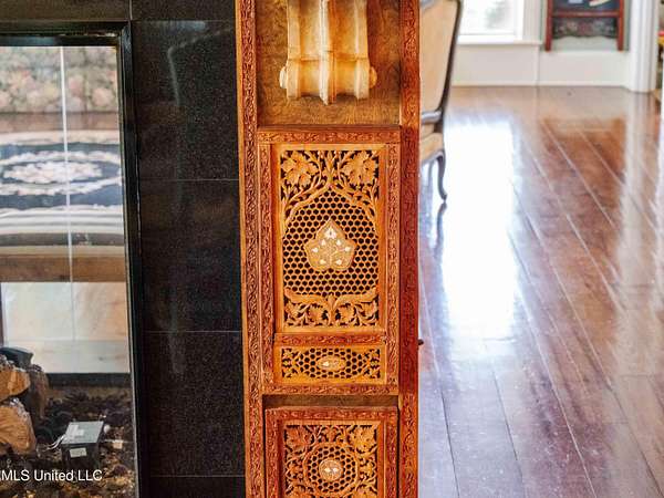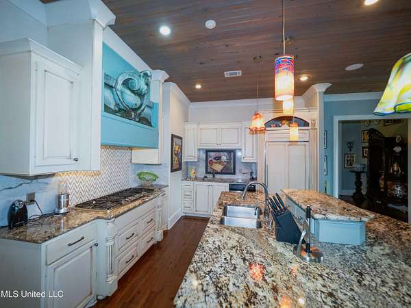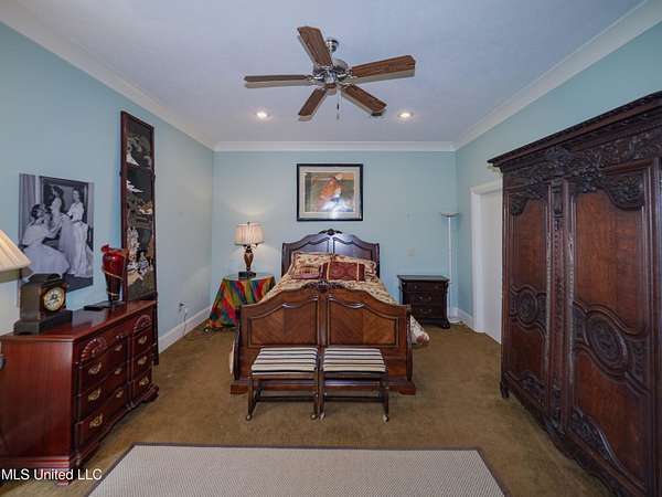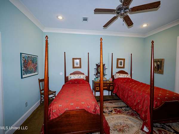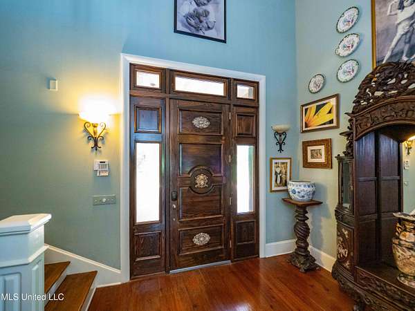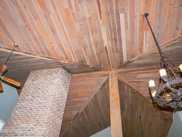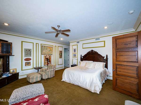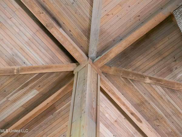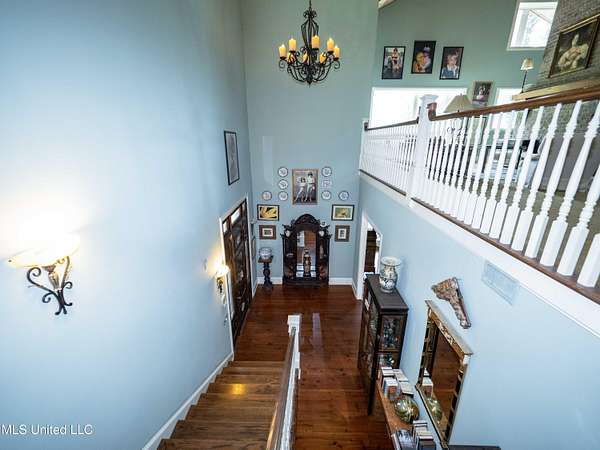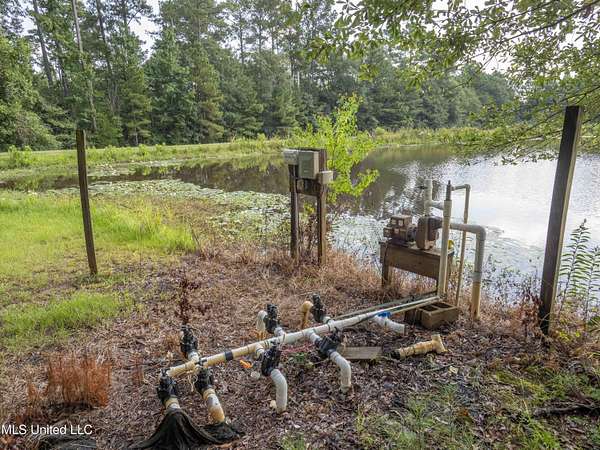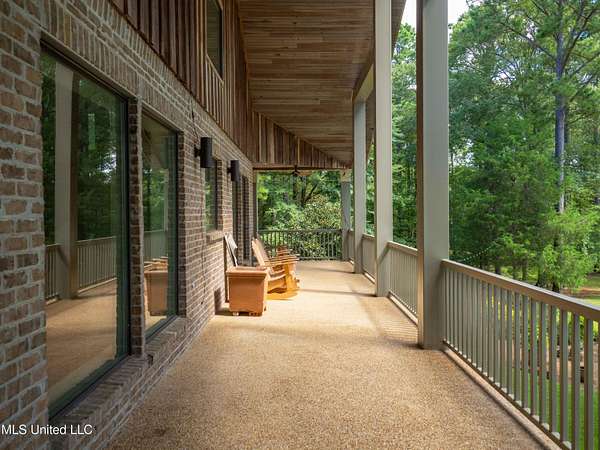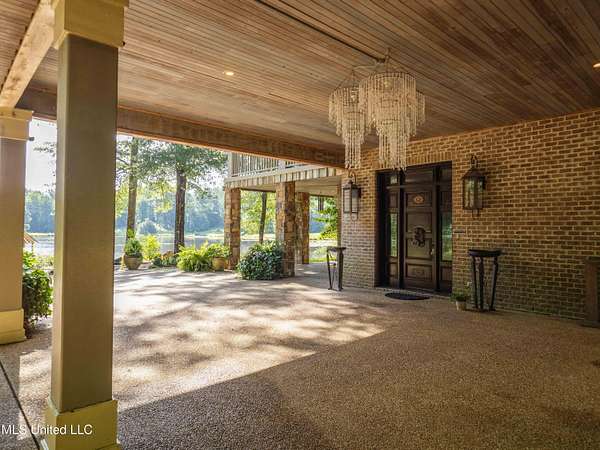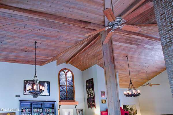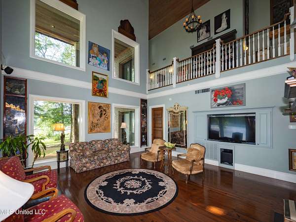 Built in 2007 this Residence was featured in Mississippi Magazine's September/October 2010 issue. Since 2014 it has served both as a primary residence and a wedding venue with approximately 40 weddings held at the property. Located south of Florence Mississippi, this property is approximately 58 acres. The gated entrance leads to an 11-acre lake, a 4980 square foot main residence, and a 30 x 90-foot Chapel. The main house has a unique 4-gabled, or cross gable roof system. This allowed the use of large windows in all living areas which create beautiful views of the lake and property throughout the home. A wrap-around porch outside the first floor living area compliments the wrap-around balcony on the second floor. From the three-car carport you enter the home to a large open staircase and foyer. The first guest bedroom and bath are to your right. Beyond the foyer is a beautiful gourmet kitchen with a large island overlooking a dining area. The kitchen boasts a double oven and warming drawer, microwave, separate sink and dishwasher, six burner gas cooktop, island with double sink and a large built-in refrigerator. The pantry has a separate freezer, a second dishwasher, sink, wine cooler and cabinetry with ample storage. The dining area is highlighted by a large window overlooking the lake. The ceiling is wood planking. From the kitchen/dining area you walk into the main living area. The beaded cypress ceiling towers 34' above you and the second floor is open to the room. The massive double fireplace is visible all the way to the ceiling, and you are surrounded by large windows with spectacular views of the lake and porch on two sides. From the main living area, the large second floor windows mirror the first-floor windows. Light filters through them from the surrounding trees. You can see the overhang of the wood planked second floor balcony ceiling with its gable roof as well. At the end of the main living area is the entrance to the primary bedroom with fireplace and his and her bathrooms. The main bathroom has a large walk-in closet, makeup area, large vanity and sink, jetted tub, and laundry room for the washer and dryer. His bathroom has a walk-in shower and a closet that also serves as an electronics room. The staircase in the foyer leads to the second floor. As you reach the second floor, to the right is second guest bedroom and bath. The stairway opens to a living area with its own fireplace. The fireplace is built into same chimney which the first-floor double fireplace uses. The second floor is surrounded on three sides by large windows with views of the lake and property like the first floor. You can access a wide balcony which wraps around the corner of the house and overlooks the grounds and lake below. From the living area a wide interior walkway leads past an area for a game table and a door to the rear second-floor porch. The covered porch overlooks the shaded garden and walkways in the rear of the home. Overhead is a large stained-glass window which was salvaged from an old church in Ireland. From there you can walk to the end of the second floor and enter the third guest bedroom and bath. You can also access the front balcony just outside the third guest bedroom. Building Note: The main house was constructed with Insulated concrete forms (ICF). According to ICF Builder Magazine, homes built with ICF construction can withstand winds of more than 200 mph. Superform, a leader in ICF construction also noted, ICF homes have a fire resistance rating of 4 hours vs 15 to 20 minutes for traditional wood framed homes. They go on to say the insulation rating and sound proofing on ICF constructed homes is superior to traditional wood frame homes with fiberglass insulation. The main house also has two 5 ton HVAC systems, each in a separate zone. The property has a 30 x 90-foot building called the Chapel. The Chapel has a 30 x 30-foot storage room with separate bathroom and a 30 x 60 foot shed which is used for a covered wed