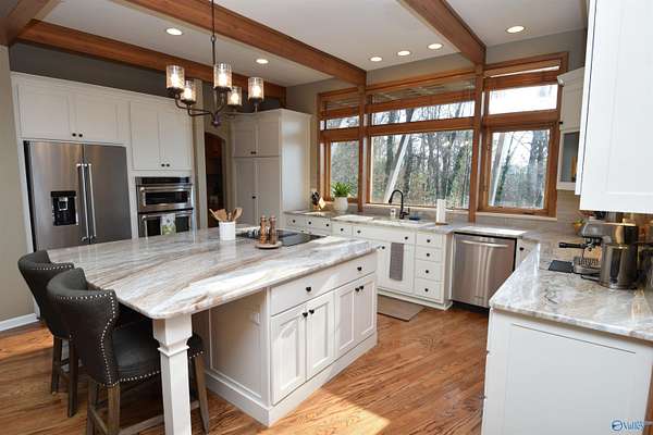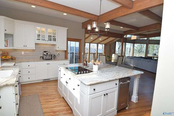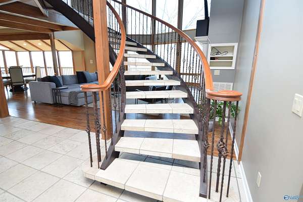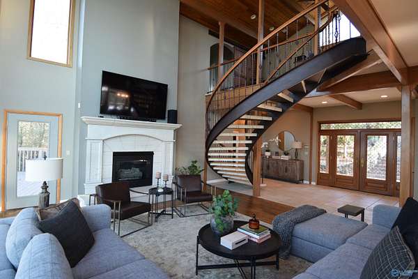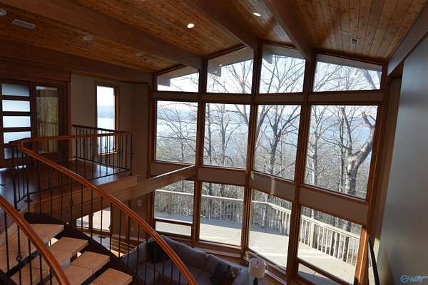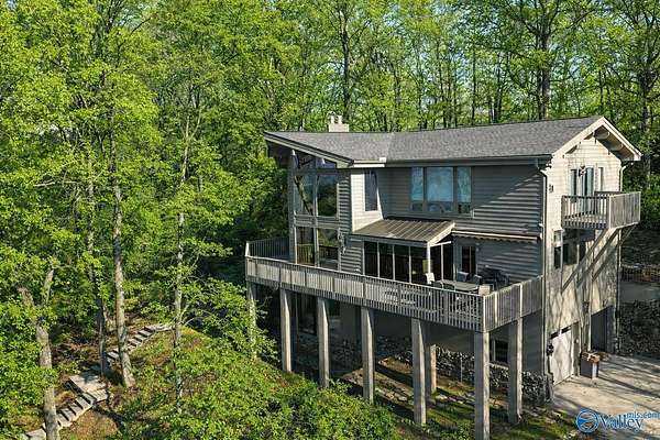 Welcome to this stunning 4-bdrm retreat on 4 private acres overlooking Lake Guntersville. This home features an open floor plan, sweeping views from every room, and multiple decks that embrace the outdoors. A dramatic floating staircase anchors the living space, complemented by three fireplaces for year-round warmth. The recently remodeled kitchen blends style and function, perfect for everyday living. Each bedroom includes its own private bath, and the spacious primary suite offers a true escape with a custom walk-in closet. A private roadway is already cut for a potential second driveway, ideal for adding a detached garage or carport. A rare blend of elegance, privacy, and natural beauty.