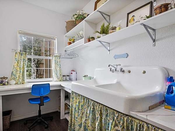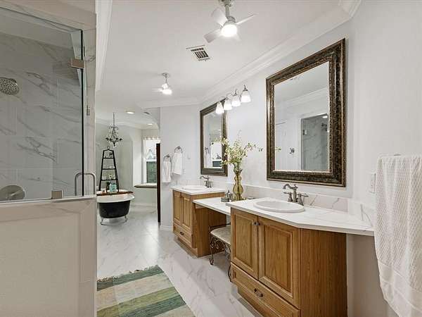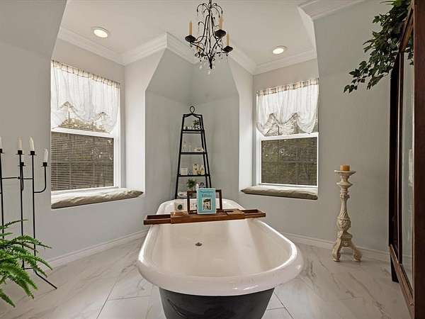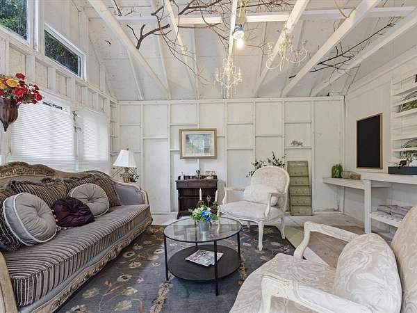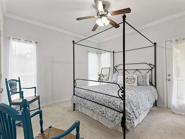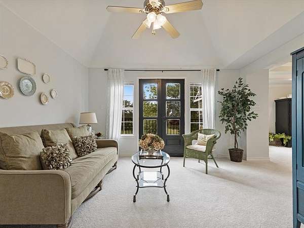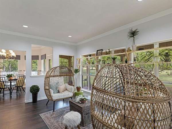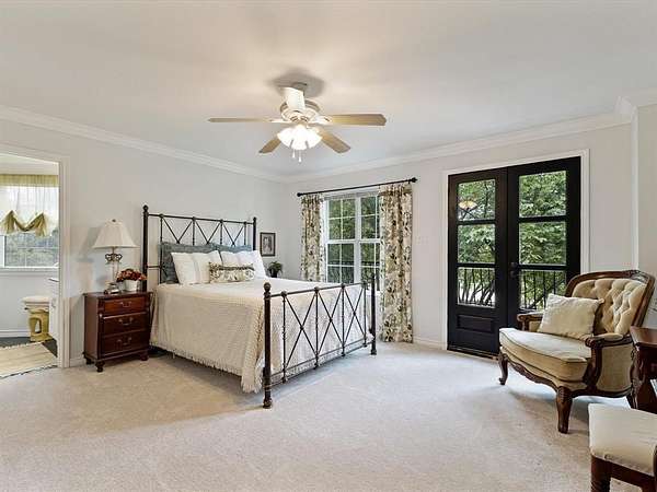 Embrace the romance of Spanish hacienda living in this one-of-a-kind custom estate, nestled on a serene, tree-lined property behind a private gated entry. A circular drive leads to striking Spanish-style double entry doors with arched tops, lited panels, and iron detailing. Turret-inspired architecture, lush landscaping, and charming Juliette balconies create unforgettable curb appeal. Inside, you'll find soaring ceilings, a grand staircase with iron railings, rich wood floors, and natural light throughout. The main living room features one of two elegant fireplaces and dramatic floor-to-ceiling windows overlooking the scenic backyard. A secondary living area offers a more intimate space with French doors and warm accents, while the formal sitting room is framed by oversized Spanish-style double doors for added grandeur. The open-concept kitchen blends rustic charm with modern function and flows into a formal dining room adorned with chandeliers and arched French doors. Upstairs, the spacious primary suite is a true retreat, featuring a private sitting area, double doors, Juliette balcony, and a luxurious spa-style bath complete with dual vanities, marble flooring, and a freestanding clawfoot bathtub. This home also offers a media room, oversized guest bedrooms, and a large upstairs flex space--perfect as an office, gym, or lounge--with direct access to the breathtaking 872 sq ft open-air balcony for relaxing or entertaining. Outdoor living is equally exceptional with multiple covered patios, a full wraparound porch, and a fully equipped outdoor kitchen. The detached art studio or she-shed features exposed wood beams, abundant windows, and endless creative possibilities. With two fireplaces, a 3-car garage, iron double doors, and thoughtful architectural details throughout, this estate perfectly balances old-world charm and modern luxury.