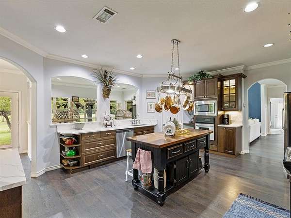 - Cathedral Ceiling(s), Decorative Lighting, Double Vanity, Eat-In Kitchen, Granite Counters, High Speed Internet Available, Kitchen Island, Multiple Staircases, Natural Woodwork, Pantry, Vaulted Ceiling(s), Walk-In Closet(s)
