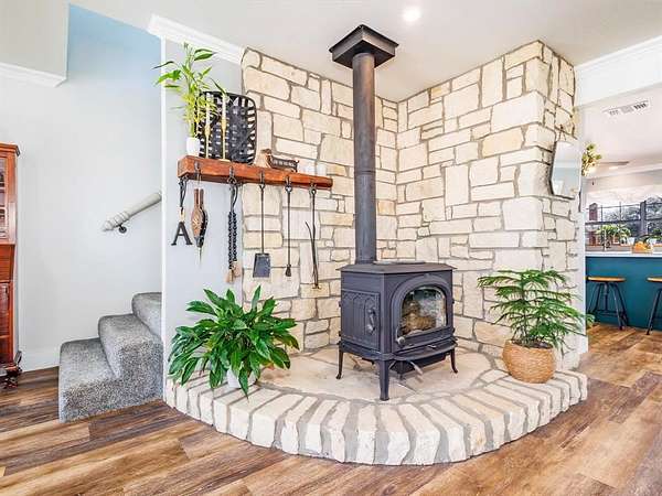 - Central, Electric, Fireplace(s), Wood, Wood Stove