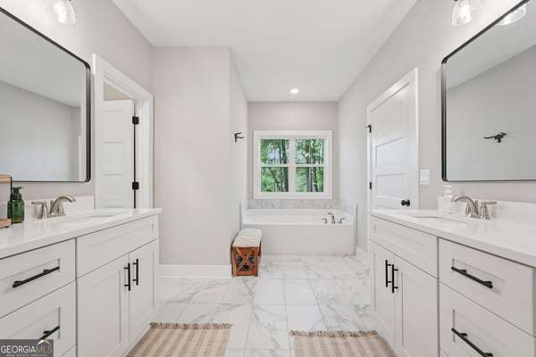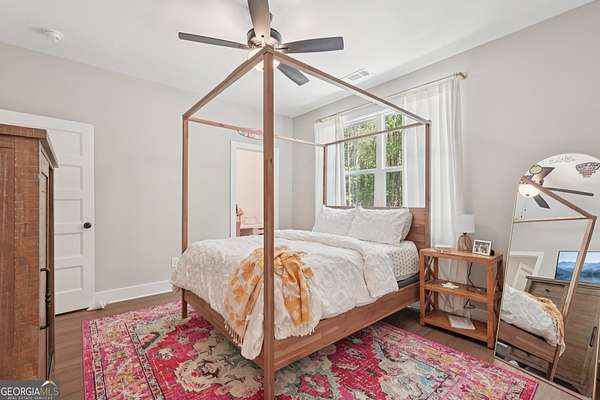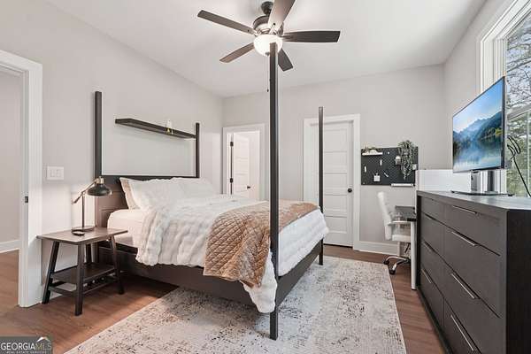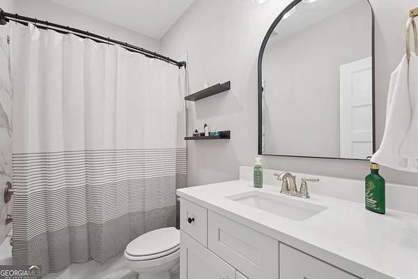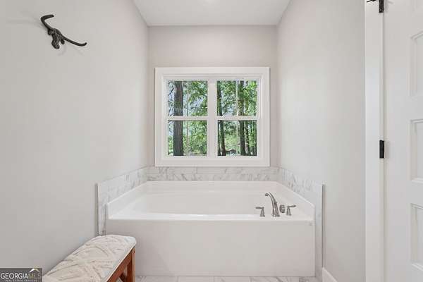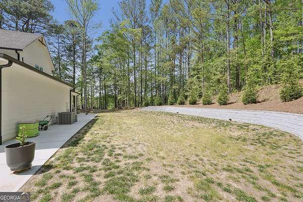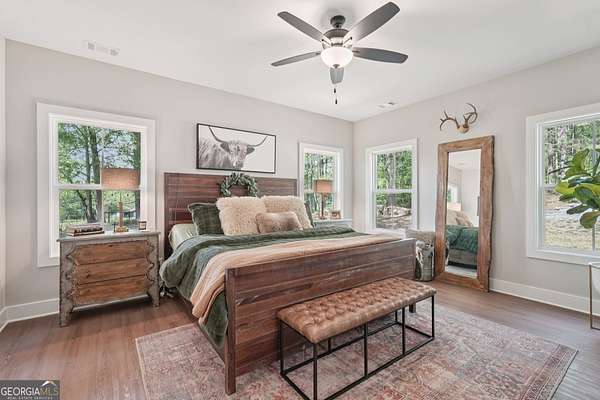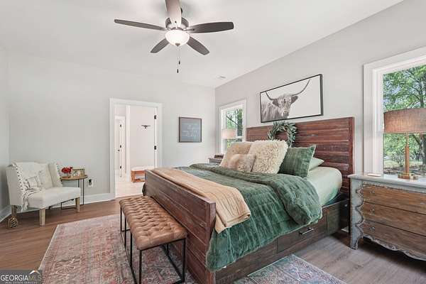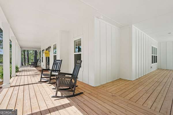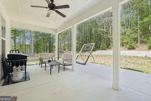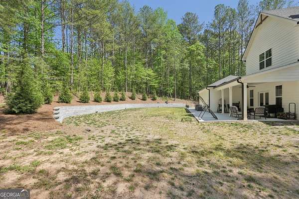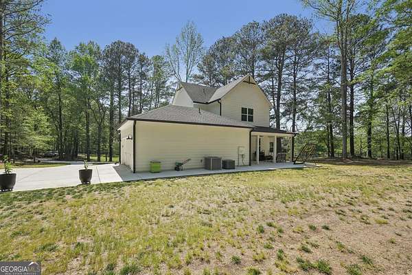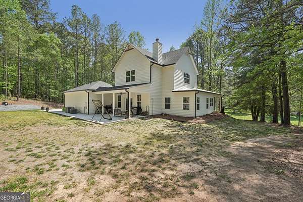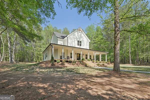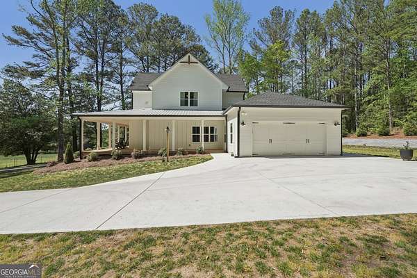 Built in 2025 and sitting atop a gentle rise on nearly 5 private acres in Newnan, Georgia, this stunning 4-gabled farmhouse is the kind of home that makes you exhale. The wrap-around front porch is made for rocking chairs, ferns, and fireflies dancing across the front pasture at dusk. From the moment you pull up, you already know this one is different. Step inside and the open-concept main level delivers on every promise the exterior makes. The large kitchen, dining space, and living room flow together effortlessly, designed for real life and real entertaining. The main level primary suite is a true retreat, bathed in natural light with a spa-like bath featuring separate tub and shower, double vanities, and not one but two closets, now fitted with a custom closet system that makes getting ready feel like a luxury every single morning. The custom laundry room and pantry have been thoughtfully designed so that the spaces you use every day actually work the way you need them to. Upstairs, two additional bedrooms each have their own full bathrooms and two closets, plus a generous fourth bedroom that works beautifully as a media room, home office, or flex space, giving everyone in the home their own space to spread out. Out back, the covered porch leads to a completely refreshed outdoor living experience. Extended concrete patio space has been added, giving you a true backyard destination whether you are hosting a crowd or enjoying a quiet evening under the stars. The woods surrounding the property have been cleared and cleaned up, opening the land and letting the natural beauty of the acreage speak for itself. A brand new pole barn and additional parking make this property as functional as it is beautiful, with room for equipment, toys, a workshop, or whatever your next chapter calls for. This is southern living done exactly right, and it is ready for you now.