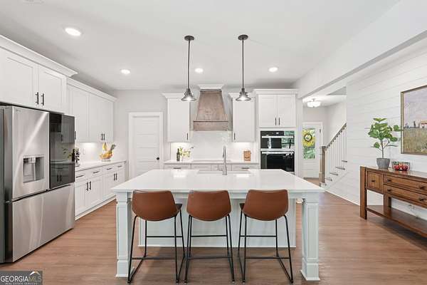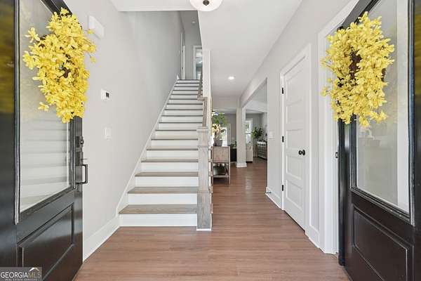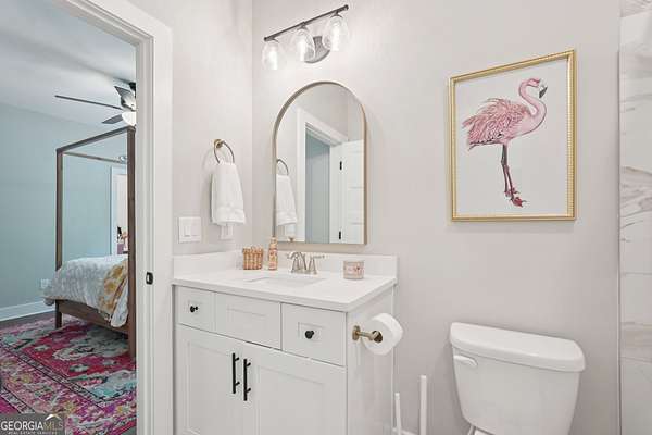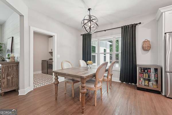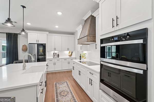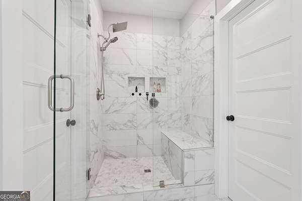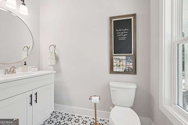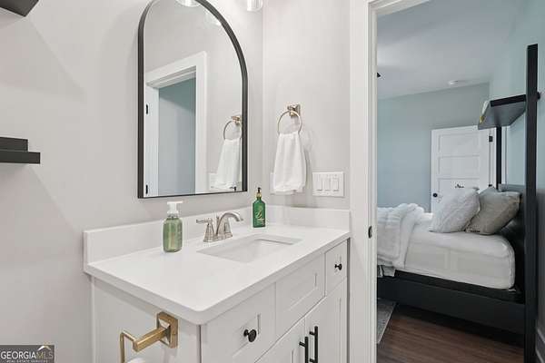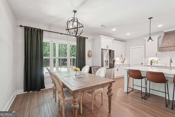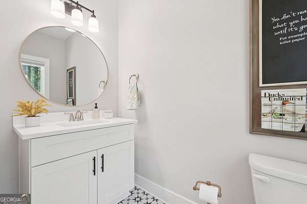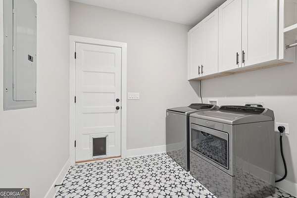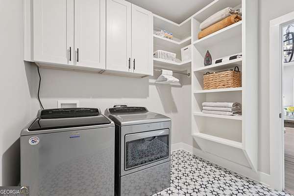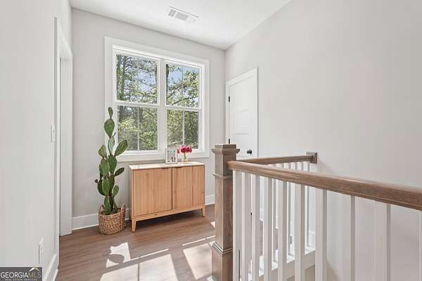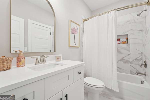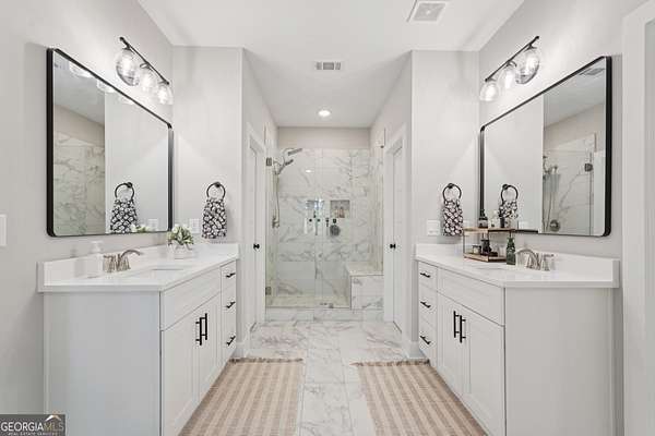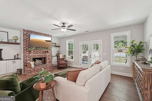 Built in 2025 and sitting atop a gentle rise on nearly 5 private acres in Newnan, Georgia, this stunning 4-gabled farmhouse is the kind of home that makes you exhale. The wrap-around front porch is made for rocking chairs, ferns, and fireflies dancing across the front pasture at dusk. From the moment you pull up, you already know this one is different. Step inside and the open-concept main level delivers on every promise the exterior makes. The large kitchen, dining space, and living room flow together effortlessly, designed for real life and real entertaining. The main level primary suite is a true retreat, bathed in natural light with a spa-like bath featuring separate tub and shower, double vanities, and not one but two closets, now fitted with a custom closet system that makes getting ready feel like a luxury every single morning. The custom laundry room and pantry have been thoughtfully designed so that the spaces you use every day actually work the way you need them to. Upstairs, two additional bedrooms each have their own full bathrooms and two closets, plus a generous fourth bedroom that works beautifully as a media room, home office, or flex space, giving everyone in the home their own space to spread out. Out back, the covered porch leads to a completely refreshed outdoor living experience. Extended concrete patio space has been added, giving you a true backyard destination whether you are hosting a crowd or enjoying a quiet evening under the stars. The woods surrounding the property have been cleared and cleaned up, opening the land and letting the natural beauty of the acreage speak for itself. A brand new pole barn and additional parking make this property as functional as it is beautiful, with room for equipment, toys, a workshop, or whatever your next chapter calls for. This is southern living done exactly right, and it is ready for you now.