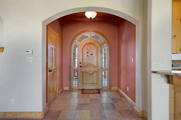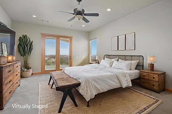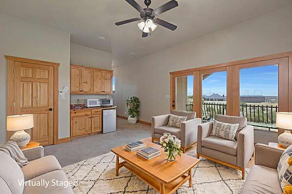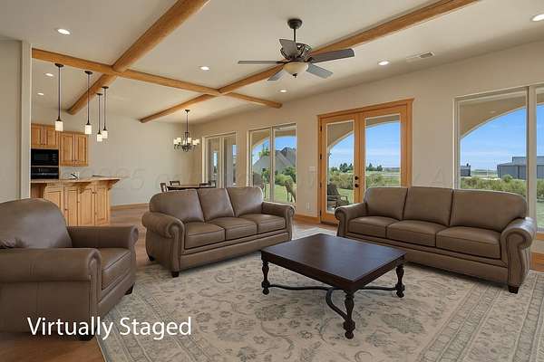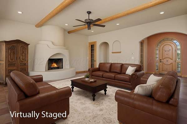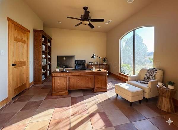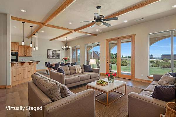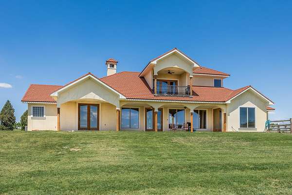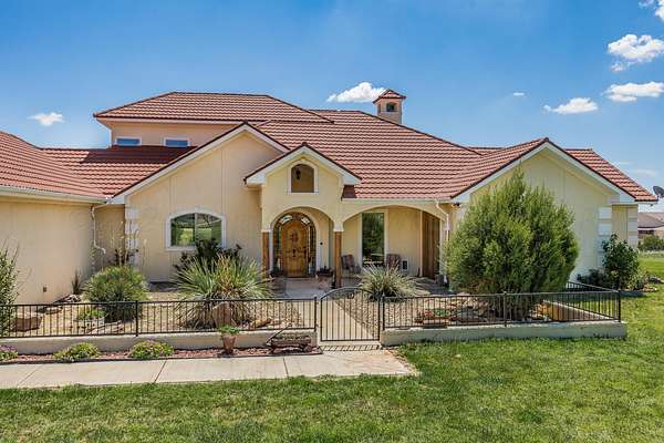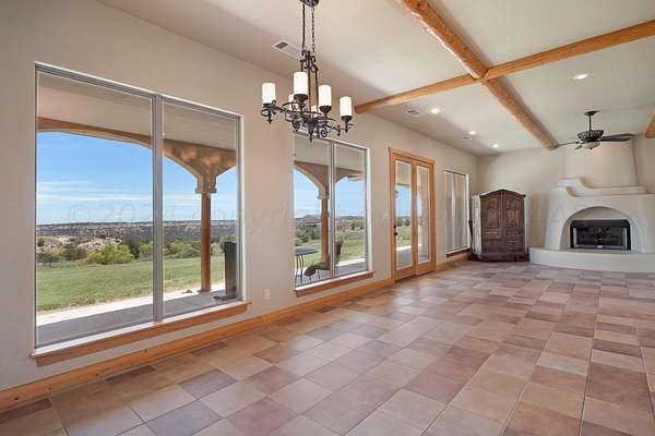 Beautiful River Falls custom built home situated on 5 acres. This home features an open concept living area with beautiful views of a canyon draw. The downstairs primary bedroom boasts a Santa Fe style dual fireplace shared with the living room. The downstairs bedroom and study have doors leading to patios with beautiful views of the property. Bathrooms and kitchen feature granite countertops with colors emulating the Panhandle sunsets. and canyon. Head upstairs to the spacious bedroom and enjoy a canyon view from the balcony. The barn is perfect for animal lovers or a workshop. New owners will enjoy the 500 acres Refuge for hiking, biking, four wheeling and fishing, nine hole 3 par golf course and driving range