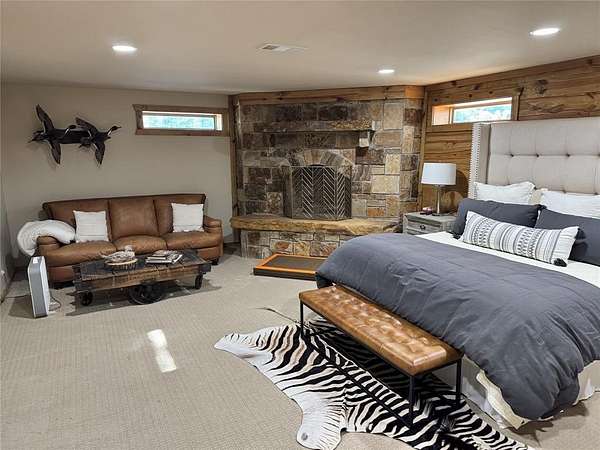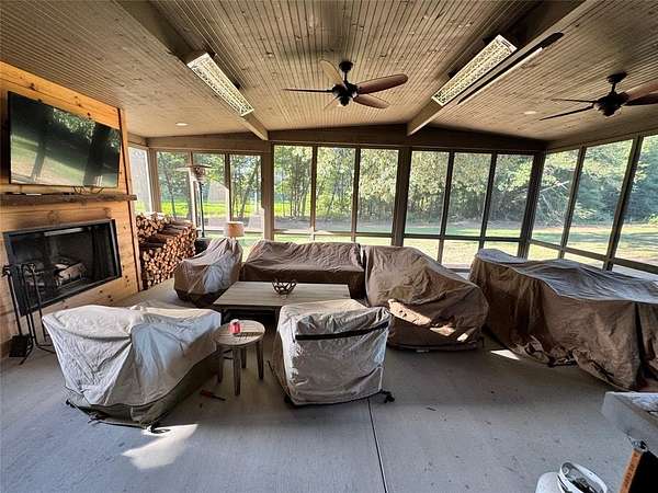 Three fireplaces: one shared between the living room and game room, one in a master bedroom, and one on the expansive screened-in back porch overlooking Crooked Creek.