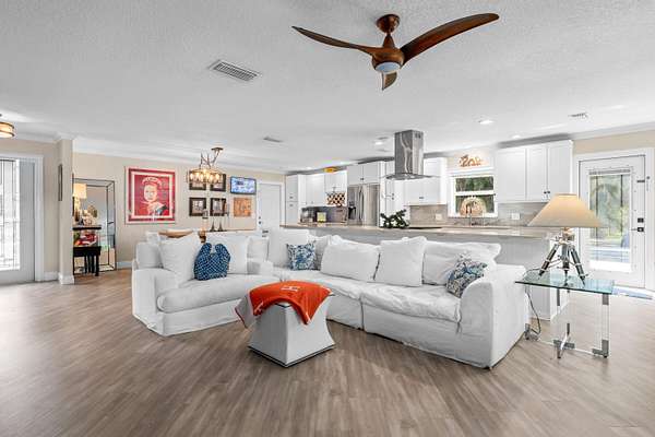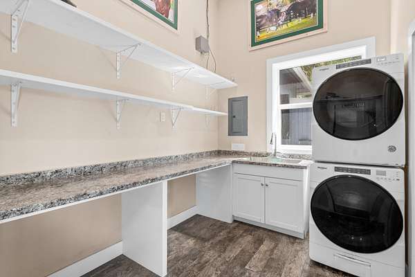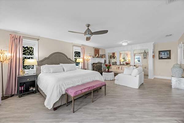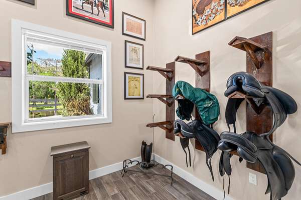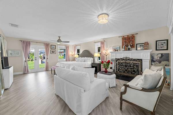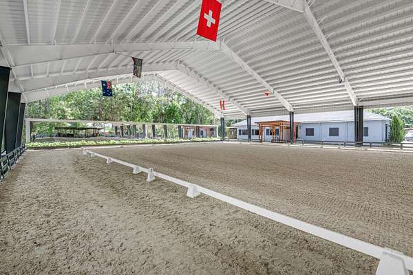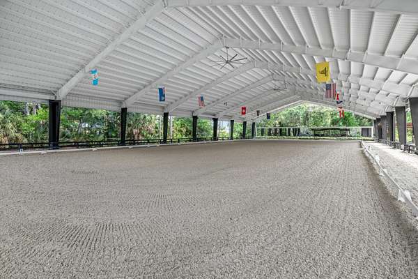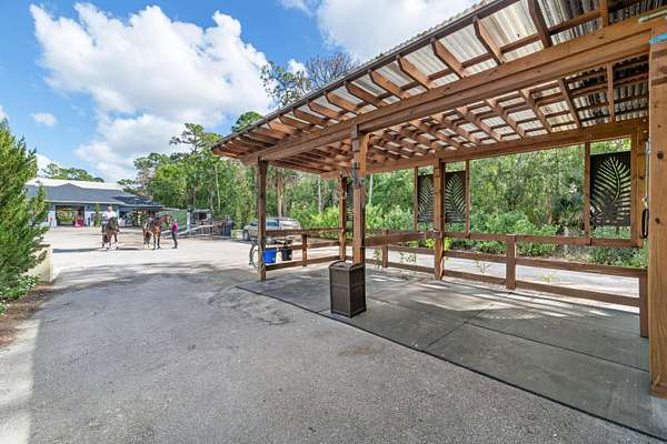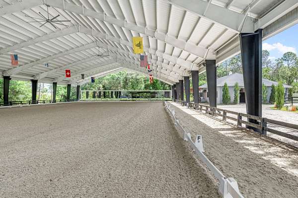 Available for annual or seasonal rental- 17 stalls, 5bed/3bath home, grooms apartment and rv hookups- Owner is willing to lease all together or separately. Set beneath a canopy of mature oak trees and just 13 minutes from Wellington International, this exceptional equestrian estate features two CBS barns totaling 17 stalls, thoughtfully designed with custom stall fronts, elegant chandeliers, and quality finishes throughout. Newly constructed 2022 covered arena (120 x 190) with GGT footing, Ebb & Flow watering system, custom mirrors, fans and spacious viewing area delivering an elevated experience. Supporting the facility are eight irrigated paddocks, a round pen, tack room with lounge, feed rooms, full bathroom with wood tile accents, laundry and exceptional groom's quarters. The grounds also feature a pond with a dock and seating area, a fenced dog park, and a gazebo ideal for entertaining or quiet evenings outdoors. Surrounded by lush landscaping and natural shade, the property offers both privacy and functionality, with a layout ideal for a boutique training operation or private equestrian retreat-just moments from the heart of Wellington's world-class competition venues. Also available is a completely remodeled 5-bedroom, 3-bath residence seamlessly blends comfort and style. The chef's kitchen is centered around a dramatic 15-foot island with quartzite countertops, stainless steel appliances, and a wine chiller, ideal for both everyday living and entertaining. The primary suite offers a private retreat with a wood-burning fireplace, an expansive custom walk-in closet with seating area, and a beautifully appointed bath featuring dual vanities, a soaking tub, and a walk-in shower with dual shower heads. A guest ensuite bedroom provides additional comfort and flexibility for visitors. Outdoor living is equally impressive, with a private, fenced pool terrace finished in travertine with custom turf inlay, creating a clean, architectural aesthetic with a relaxed, resort-style feel.