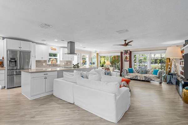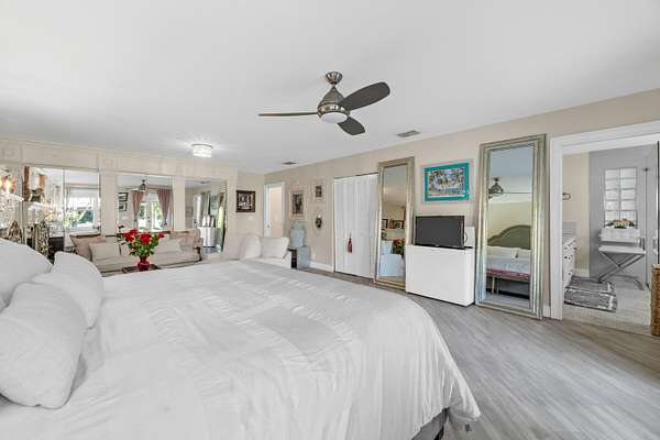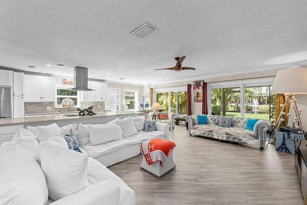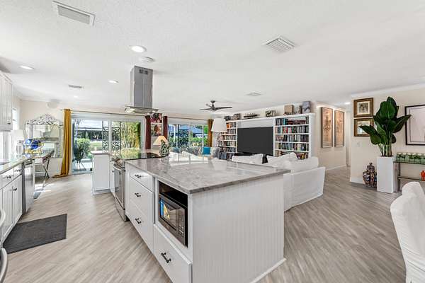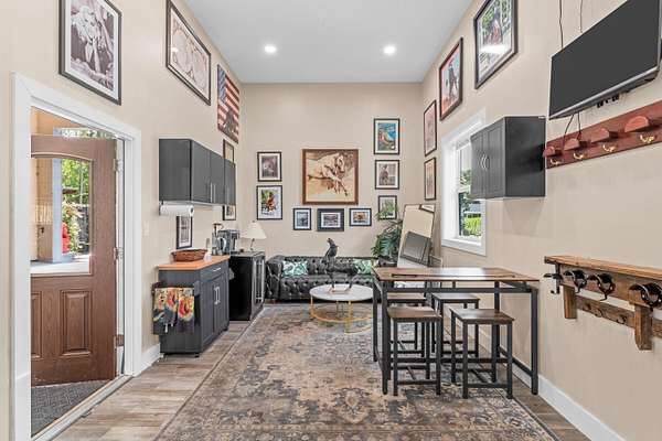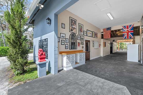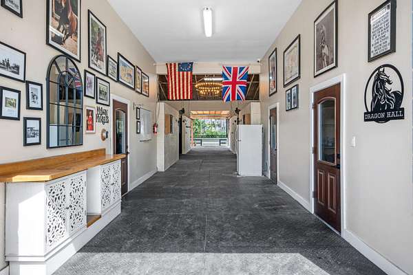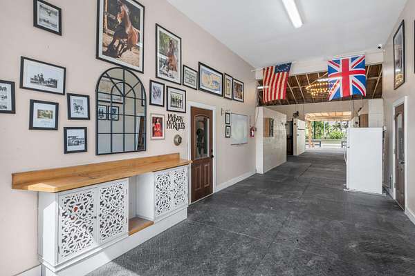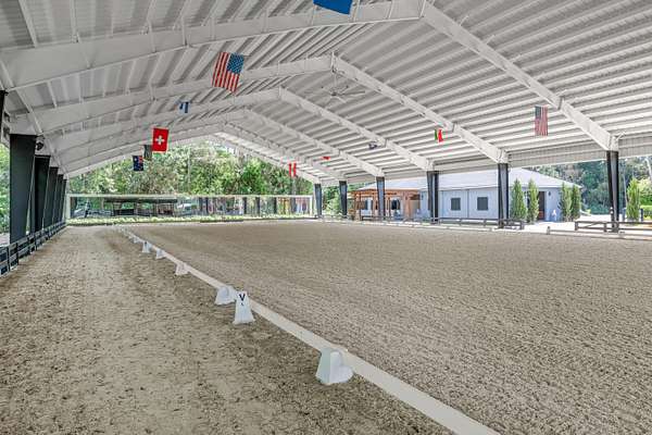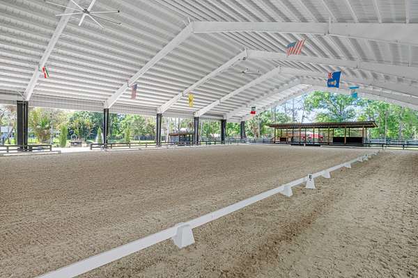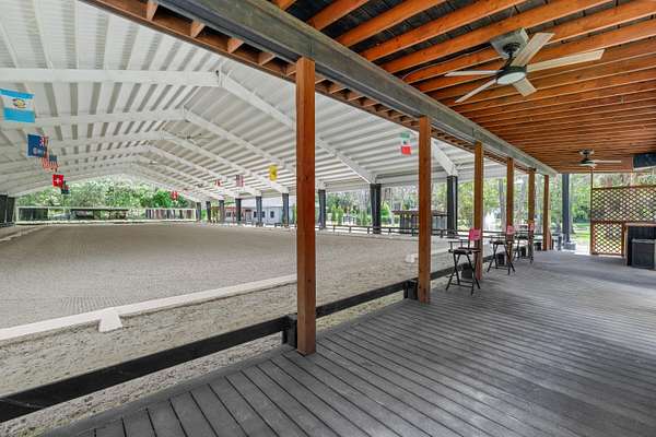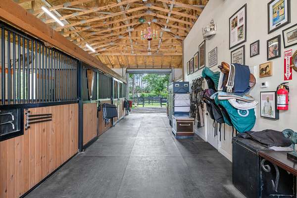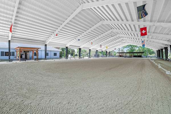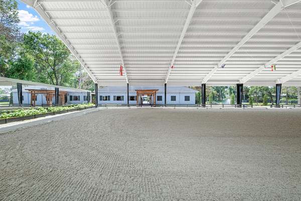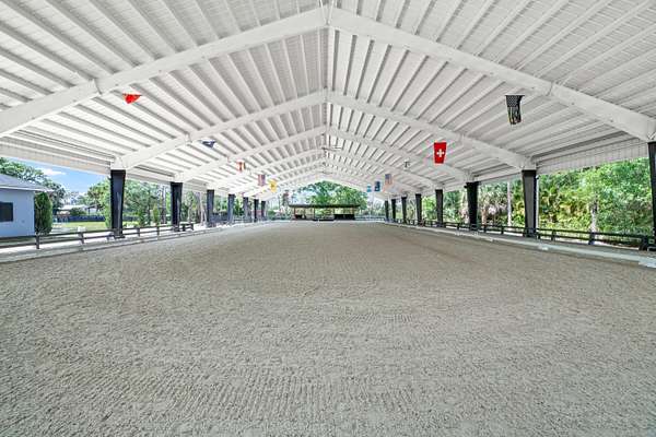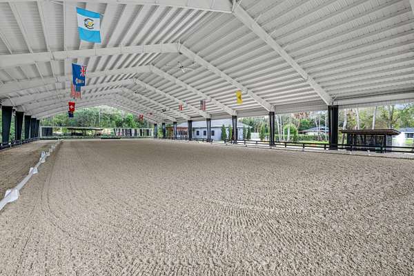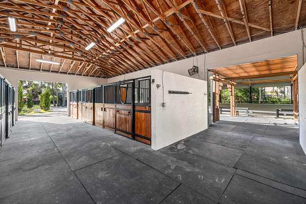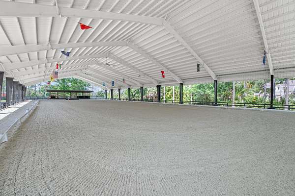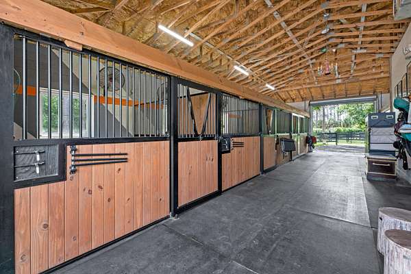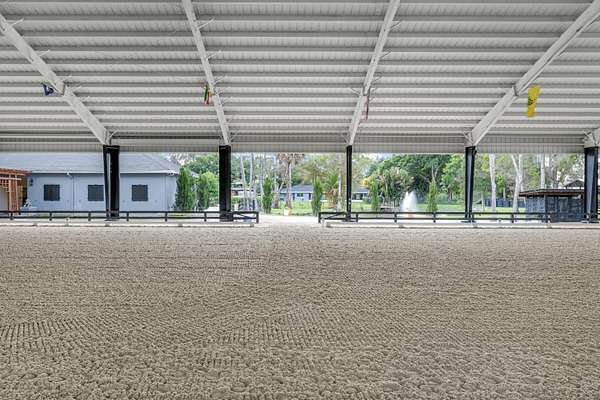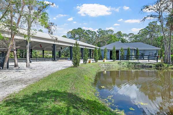Set beneath a canopy of mature oak trees and just 13 minutes from Wellington International, this exceptional equestrian estate offers a rare blend of top-tier equestrian facilities and refined residential living, all within a private, beautifully landscaped five-acre setting. The property features two CBS barns totaling 17 stalls, thoughtfully designed with custom stall fronts, elegant chandeliers, and quality finishes throughout-creating a polished yet highly functional environment suited for both professional operations and private use. At the heart of the farm is a newly constructed 2022 covered arena (120 x 190). The arena is appointed with GGT footing, an advanced Ebb & Flow watering system, custom mirrors, and a spacious viewing area, delivering a consistent and elevated experience Supporting the facility are eight irrigated paddocks, a round pen, tack room with lounge, feed rooms, full bathroom with wood tile accents, laundry, and exceptional groom's quarters, offering a fully equipped, turnkey setup. The completely remodeled 5-bedroom, 3-bath residence seamlessly blends comfort and style. The chef's kitchen is centered around a dramatic 15-foot island with quartzite countertops, stainless steel appliances, and a wine chiller, ideal for both everyday living and entertaining. The primary suite offers a private retreat with a wood-burning fireplace, an expansive custom walk-in closet with seating area, and a beautifully appointed bath featuring dual vanities, a soaking tub, and a walk-in shower with dual shower heads. A guest ensuite bedroom provides additional comfort and flexibility for visitors. Outdoor living is equally impressive, with a private, fenced pool terrace finished in travertine with custom turf inlay, creating a clean, architectural aesthetic with a relaxed, resort-style feel. The grounds also feature a pond with a dock and seating area, a fenced dog park, and a gazebo ideal for entertaining or quiet evenings outdoors. Surrounded by lush landscaping and natural shade, the property offers both privacy and functionality, with a layout ideal for a boutique training operation or private equestrian retreat-just moments from the heart of Wellington's world-class competition venues.
