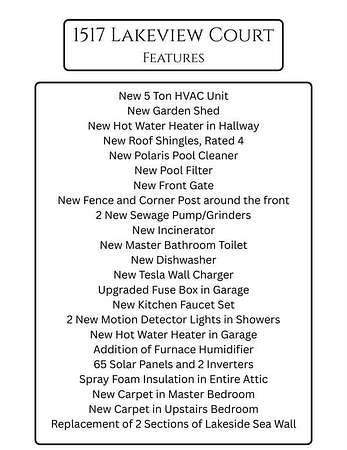 Perfect for relaxed living or entertaining, the home showcases two spacious primary suites, an updated chef’s kitchen, and an inviting living area that flows effortlessly outdoors. The extensive patio area is the ideal spot to unwind or host guests, complete with an outdoor fireplace and a refreshing in-ground pool. Whether you're sipping coffee at sunrise or enjoying evening breezes at sunset, the setting simply doesn’t disappoint. Sitting on 1.51 acres at the end of a quiet cul-de-sac, this property promises peace, privacy, and plenty of room to roam. With over 600 feet of prime water frontage, a deep-water boat dock, and space to expand it, lake living has never been easier—or more fun. In additional, this property consists of 4 lots. With a slight modification of the garage and the tennis court removed, 2 lots could be sold off separately. 65 roof mounted solar panels provide for drastically reduced electric bills! Bonus: You're tucked away just enough for solitude but still perfectly placed close to local attractions and conveniences. So whether you're seeking sanctuary, ready to entertain, or just want to collect a few adventurous fish tales or family boating fun,, this home is ready when you are.