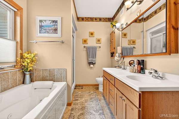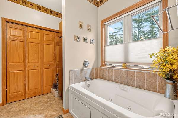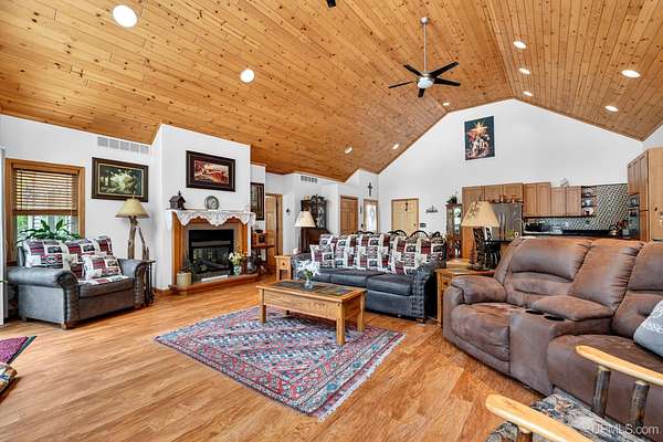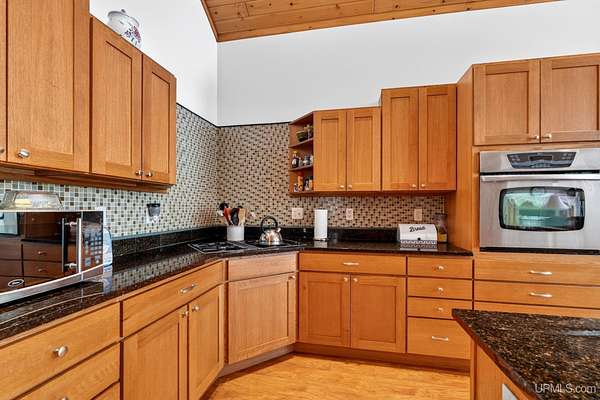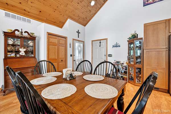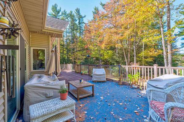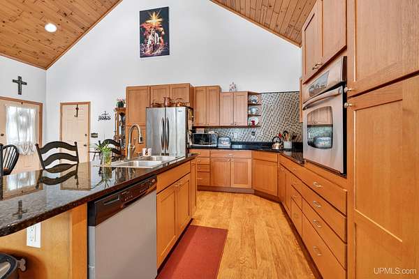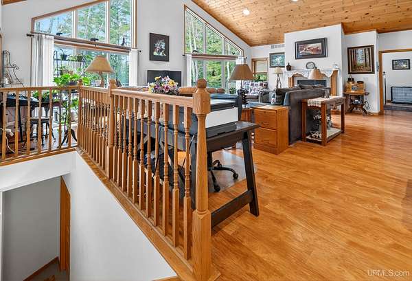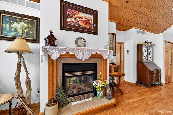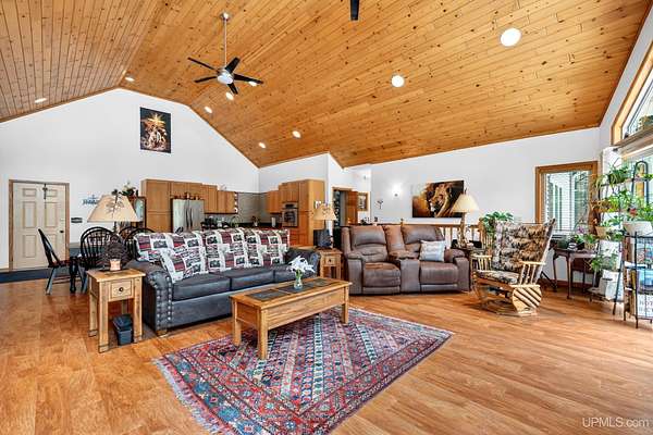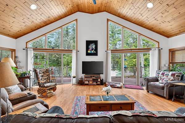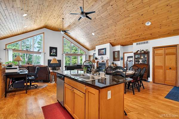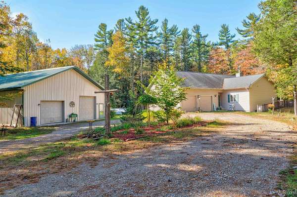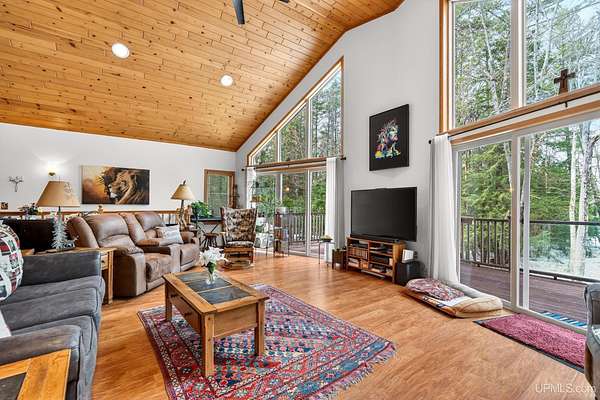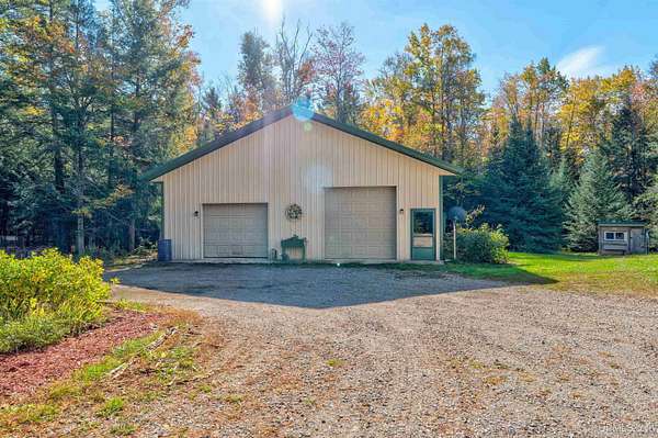 A RARE property with a combination of 241 feet of lake waterfront and over 12 wooded acres! Morning coffee never looked better from the front deck, which overlooks Jug Lake: a shallow, 35 acre lake well suited for panfishing, and ideal for quiet canoeing and kayaking. The engineered modular prow front home is nestled in the Hiawatha National Forest, with beautiful natural views from every window and quick access to all the national forest has to offer. The freshly painted main living area is open and functional, featuring a double-sided gas fireplace shared between the living room and primary bedroom. The open concept kitchen includes granite countertops, a tile backsplash, soft-close drawers, and a gas cooktop. A split floor plan offers privacy, as does the full walkout basement, which provides even more additional living space. Here you will find high ceilings, with a second kitchen, and a furnished living area, making it ideal for guests, or extended stays. Mechanically, the home is well-equipped with propane forced air heat, central air conditioning, a whole-house humidifier, air purification system, and a wired Kohler generator. A backup outdoor wood boiler supplements heat for both the home and the attached garage. Designed for comfort, this 4 bedroom, 3 bath home includes a central vacuum system, solid wood interior doors, and energy-efficient double-pane windows. The privacy of this home can't be beat, with only a handful of neighboring properties on the lake. The property also includes a large pole barn, walking trails, a stone patio, a chicken coop, and a garden area for enjoying Upper Peninsula living in all four seasons! Don't miss this storybook property that checks the boxes for space, privacy, and everyday livability.