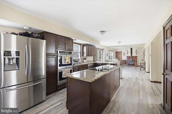 - Additional Stairway, Ceiling Fan(s), Combination Kitchen/Dining, Family Room Off Kitchen, Formal/Separate Dining Room, Open Floor Plan, Upgraded Countertops, Wood Stove